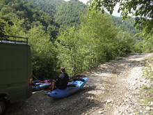 Arriving at the Tekhuri, we moved our gear into a local's van who Egor hired to drive us up the rough road that goes up along the river. The drive took over an hour and 4-wheel drive, though not mandatory, would certainly help... and clearance was mandatory. Our hope was to put in a mile or so higher than we did, but when we got there and scouted Alona and Egor said flows were on the high side and it would be better to put in below the steepest section. Apparently, there is a 20 mile section above this that is just waiting for the first decent...