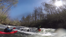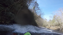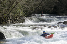 - #1 (III+ to IV-). The first rapid had two main parts. The top part was most fun on the left, where fast water dropped you through a small but sticky hole just above a 5 foot uniform pour over ledge. We went through the hole and boofed the ledge. There was another line far right if you were timid on the harder move. Downstream, the river split a bit and either channel was fine, as it rockily stepped down over one more ledge. More water would have done this move well.