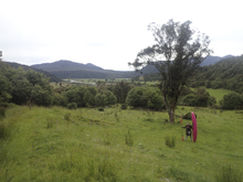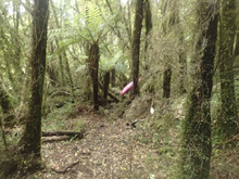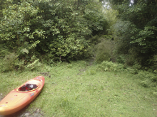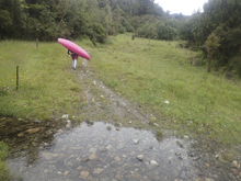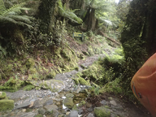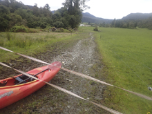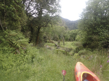 The run is short and is a hike up and paddle back, great for us since we only had one car anyways. The book led us to the take-out easily, where we studied up for the direction on the hike. Follow the old farm road and then look for a track leading up to the left into the bush. So, we began hiking... the gate was closed and locked so that added an extra half a km or so, we got to a fork in the farm road and followed it left as it looked like the "old" farm road. After a little bit of climbing we found an open meadow with a small track in the back left which led into the bush... and by that I mean it was a track sure, but it was totally overgrown. There was tape on the trees though so I felt reasonably good for the first 15-20 minutes that we were still working the correct way. It wasn't until the trail become completely overgrown and the mountain between us and the creek had grown into a large obstacle... it was at this time we went back down... and began looking in that meadow for another trail... which we found. This trail was in the back right of the meadow and was much more well traveled. So we took it... until it ended. We then looked around and found game trails and bush whacked all the while getting stung by stingy nettle before what would you know... we pop out on a farm road. By this time I had already realized that our must have been that we should stay on the lower of the farm roads early on... and it turns out that was correct. That road turns into a large trail which is very well maintained with elevated marsh crossings and everything. It is also flagged by large orange plastic triangles pinned to the tree. I view this as the second time the book failed me, after the Waiari Stream access debacle. I really don't understand why the author made it seem so much more challenging to find the trail and made it sound so much less maintained. Whatever the reason is... it took us over 2 and a quarter hours to do a hike that was meant to take 50 minutes. The group that got to put-in moments after us reported that they ran into the farmer who unlocked the gate for them, so they had a mere 20-30 minutes of walking. I really didn't want to hear about this. As it was I was getting destroyed by sand-flies and was pretty pissed about the directions we received. But in passing after our brief conversation, they mentioned there was another group behind them who were looking for 2 more for an Arahura trip the next day, so they may be right up our alley of interest. I said "ah cool" and paddled off.