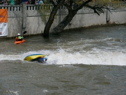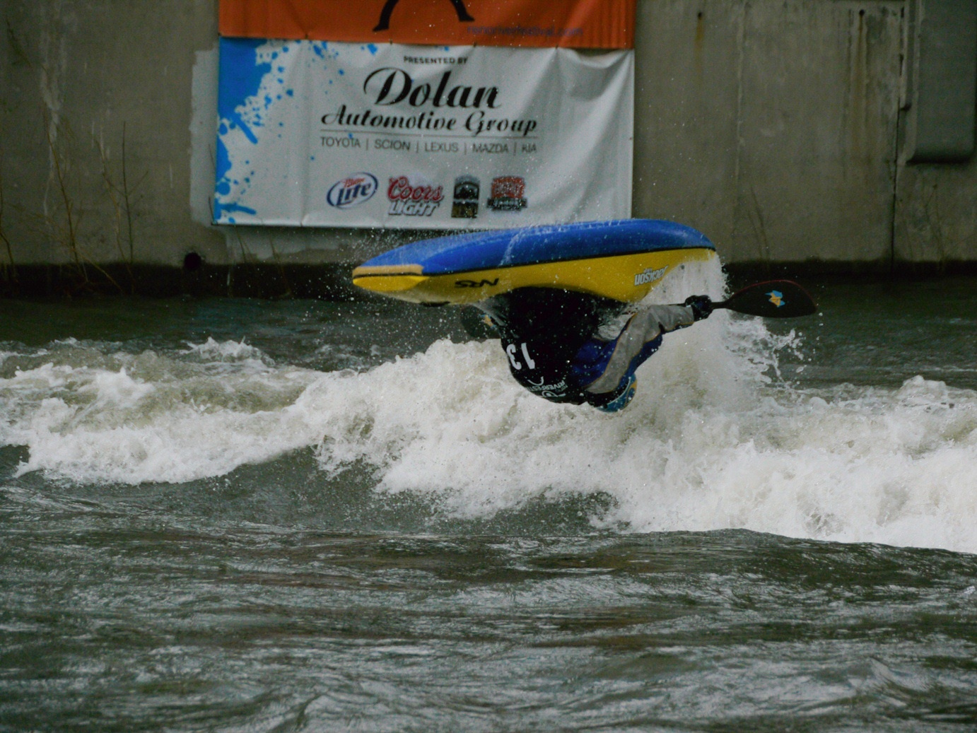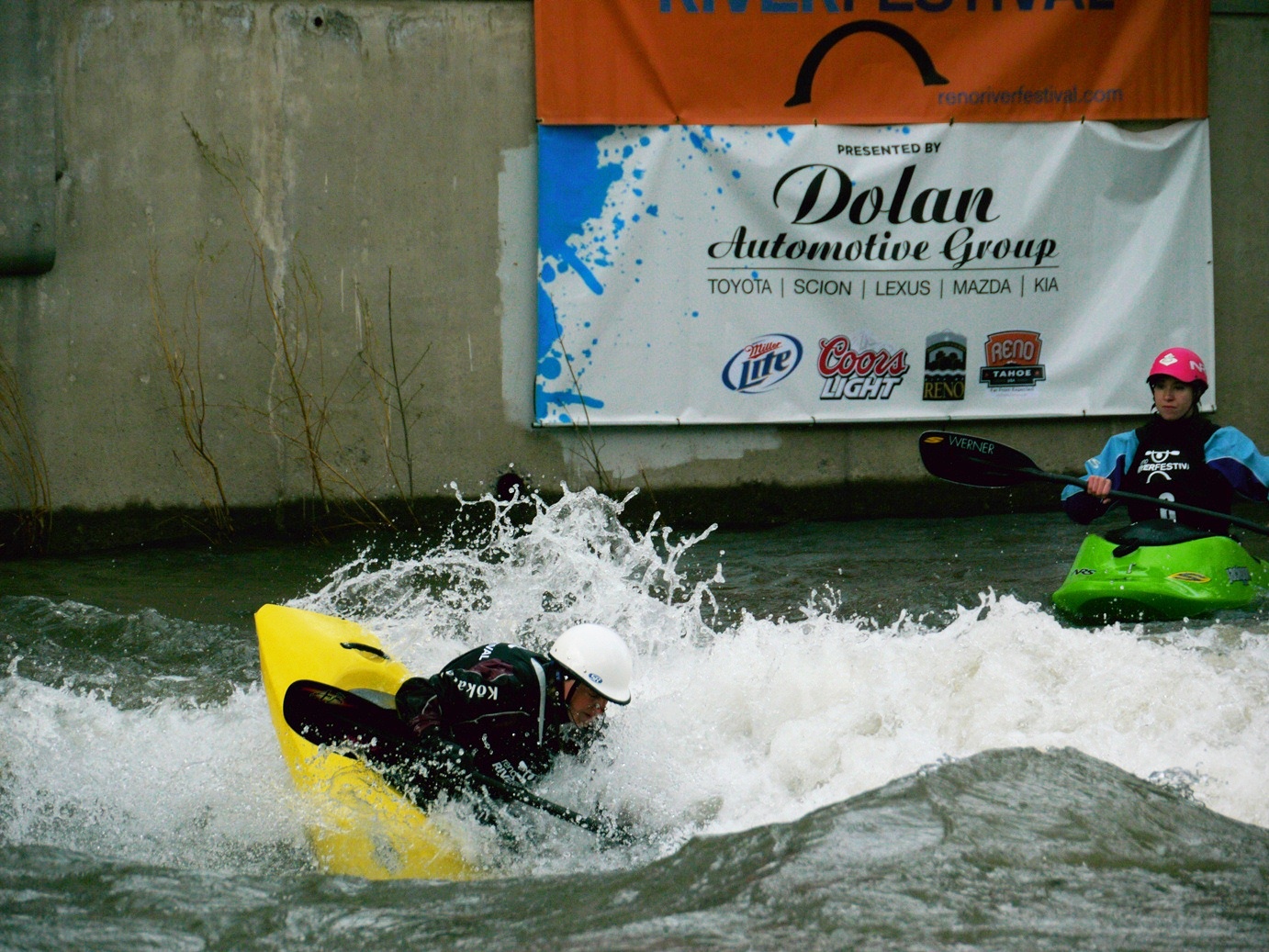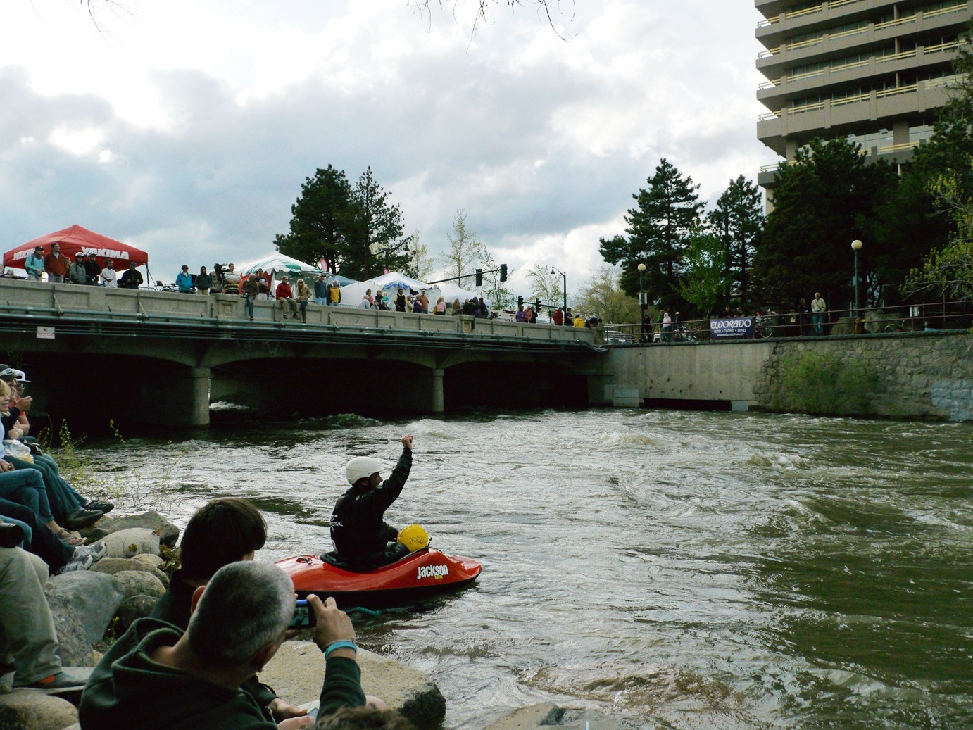 The river right channel is used for slalom and I don't remember it being any good for playboating at the lower flows. At higher flows there was one nice little hole in the middle. In total, the area is interesting. Literally in the middle of downtown Reno, you have casino and street lights illuminating the river enough to play into the night. On top of that, you have a steady stream of spectators watching you enjoy the river. During summer months (when the water is fairly low) the park is a favorite of tubers who swim down the drops.