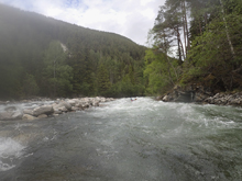 Take-out: From the confluence of the Sjoa and the Lågen, head up the Sjoa on 257 for 12.8 km. Just after you drive past the obvious gorge section upstream of the rafting companies, look for a bridge on your left. This is take-out.