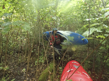 - Triple Drop with Four Drops (V). Downstream is the largest rapid of the run. There are three portions to it. The first was the mellowest and went down the left. The second had a good size hole and went well boofing far left off of the shoulder. The third tier had a row of rowdy holes across the top and then dropped onto a slide with a hump at the end that looked like being upside down was a no go. Stay far left. This then dropped into an eddy. The exit only Chad looked at from below and waved us off of the left side of the island. So looking at the right, we gave it a go. Chad and I got rejected to the left of a midstream ridge and ate shit. Me landing on my head going very fast and landing in a pothole upside down. Broached, I swam and self-rescued onto the island. The correct line was in fact the far left. Oh well. You can scout the whole thing (or portage) using a trail on the river right.