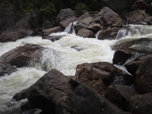 The first big set in this section is a triple drop... that has four drops. That is how I described it to a friend and he laughed and said they call it the same thing. The rapid has some big holes, and ends in some slides that you want to be upright and in control for. We scouted the set. One in our group scouted the last one and said the left channel was no go, so we looked at the right channel and the thin line and decided it went ok. Well, one week later I still regret that decision. The entrance had an s-turn before it dropped onto a slide and began to fade left to a splitter ridge. The right side dropped cleanly through a large hole, the left side into a rock and pothole. Well, trying hard to stay right I touched the wall which then deflected me to the left where I caught an edge on the ridge rock and ate shit head first into the pile of rocks on the left. I have never heard my neck crunch in the manner that it did. Instant pain. As the impacts cease, I know I am not at the bottom of the rapid. I try to roll but my paddle is prevented from reaching the surface on both sides of my boat. I pull and pop up in the pothole, by boat breached on rocks. I can't stand, I am in the middle of the river, walled out in the small space between my boat the pothole wall. I eventually manage to climb out of the pothole and get my boat dislodged and onto the small island that split the river where I empty my boat and slide back into the river. That was the biggest impact wipe out I have ever had. Seemed like an easy enough move... just poor execution.