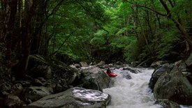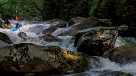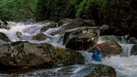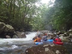 - Cave Man (V). The first of the bigger rapids as I recall. This rapid had a boof at the top that we ran on the left and then a folding falls that we boofed far right into a jut of water. The danger here is a cave just downstream that the water races towards. Apparently there is an exit in the back though in case you do end up in it.