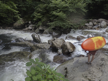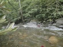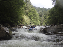 Metal Box (V). This rapid is junky and ugly! In the top eddy, on the left shore there is a metal box... you know you are here. Enter far left in a micro channel to boof down 6 feet. Then reenter the current stay center. The rapid crashes through a rock pile and clean lines look difficult to come by. At our low flow, we walked this rapid as the top and bottom were borderline. Walking on the left getting back in was delicate and involved seal launching awkwardly back into a small off shoot channel on the left.