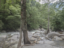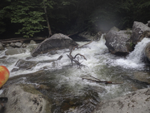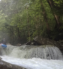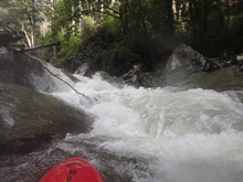 Big Tree (V). We walked the lead in due to wood. The bottom two thirds though we were able to run. Scout those sections from the lip on the right, if it is high you may not be able to get out there though. The line was to drop over a double tiered drop that is maybe 12 feet tall in total, in the far right of the river, under an overhanging tree. The first part drops 4-5 feet onto a shelf and immediately off the remaining 7-8 feet into a caldron that flushes out. The exit needs to be run with left momentum as most of the water falls off to the right and directly into a rock. It is also about 7 feet tall or so... so drive left and be left, more importantly is to be left.