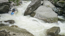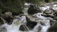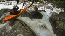 Dinosaur (V). The above boof is directly above the biggest rapid of the run. This rapid has multiple holes in the lead in, some choose to walk these holes as they lead to a big final drop. The final drop you want to be far right on, the left melts off into a punch and deep hole. The middle is backed up by a rock. At low flows the current pushes you left, at high flow you can go over a guard rock just above it making getting right easier. Some choose to put in just above the crux move making it more doable regardless of the flow.