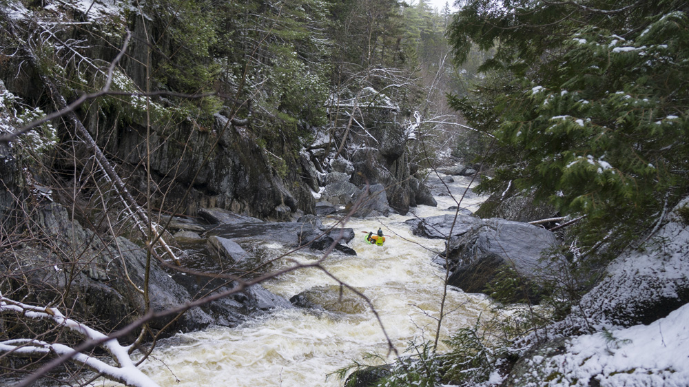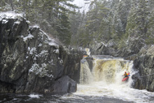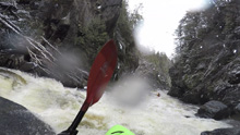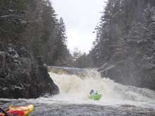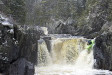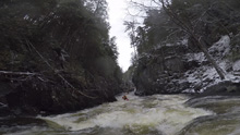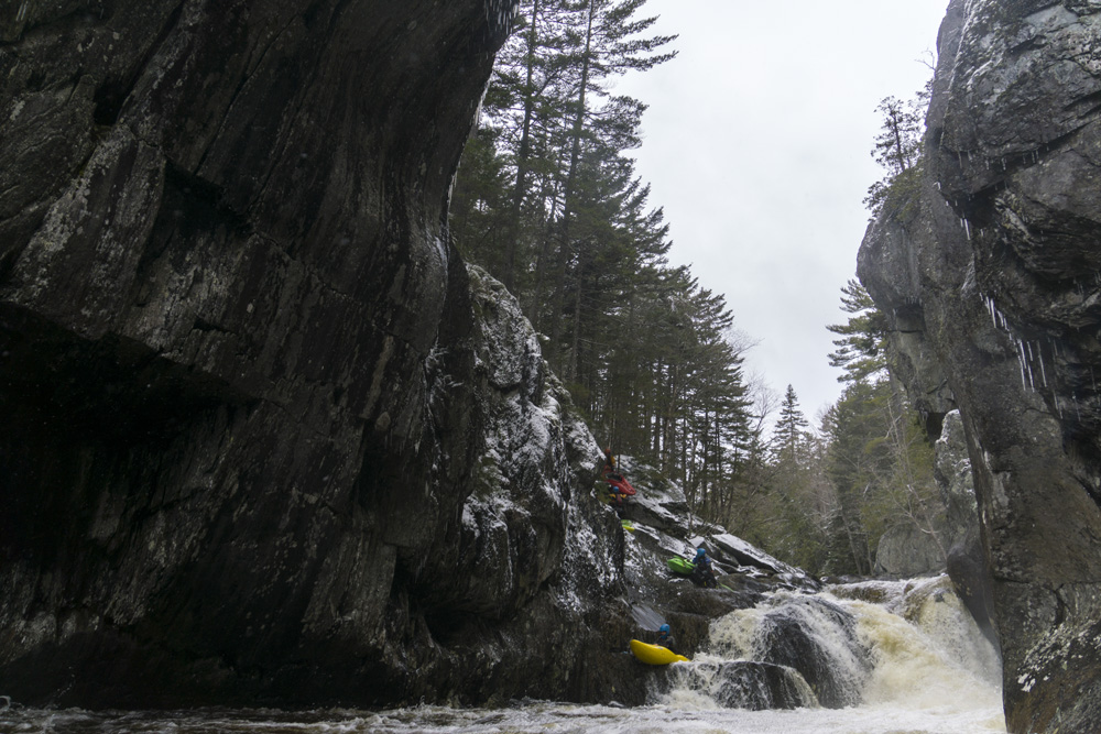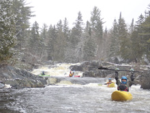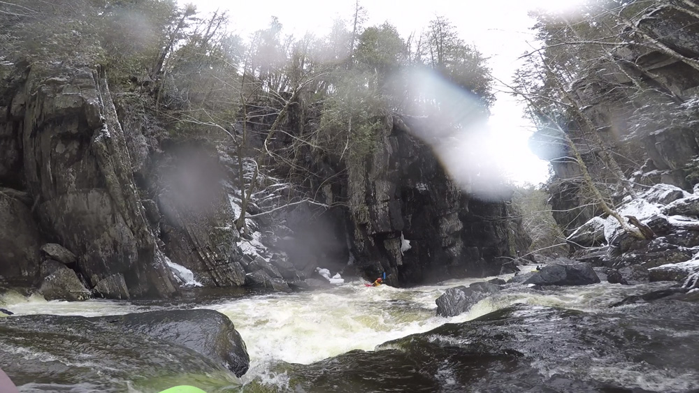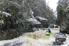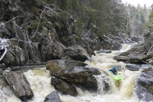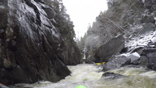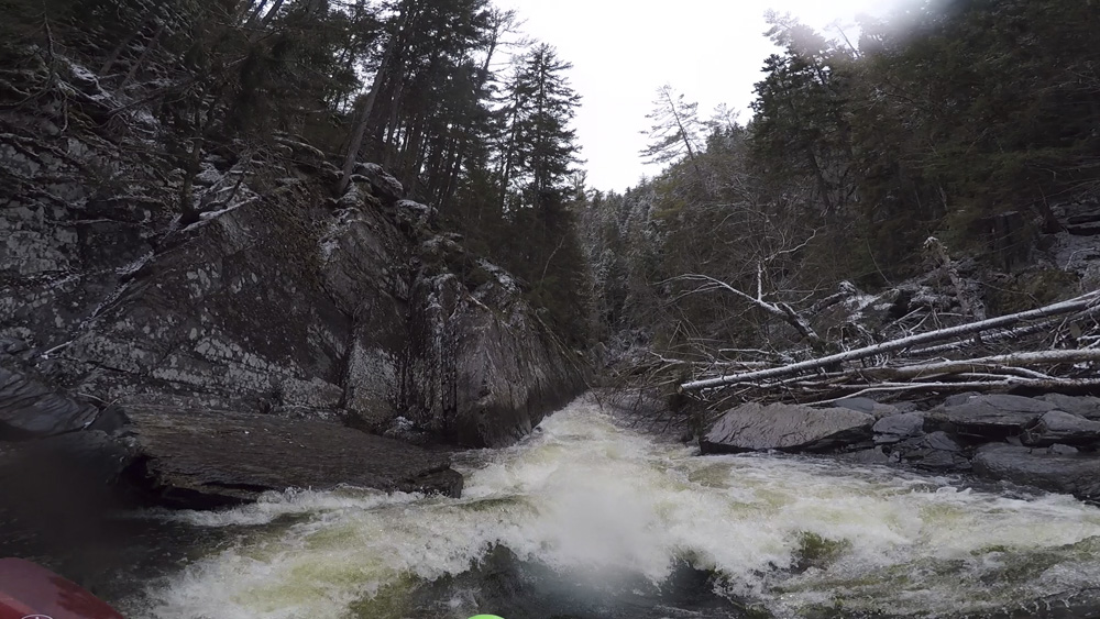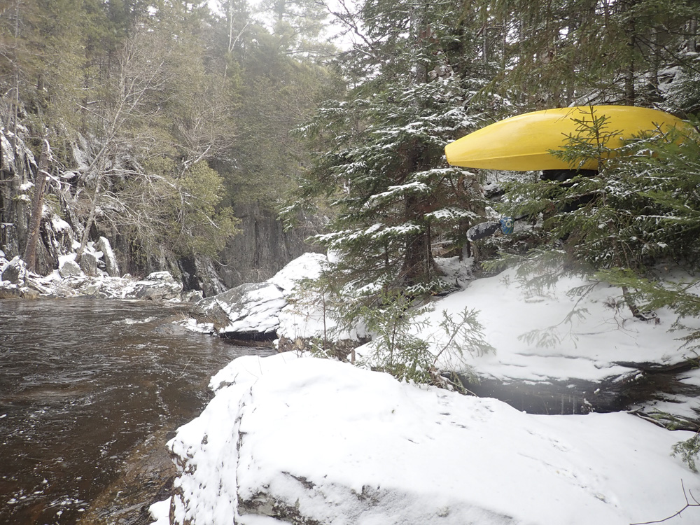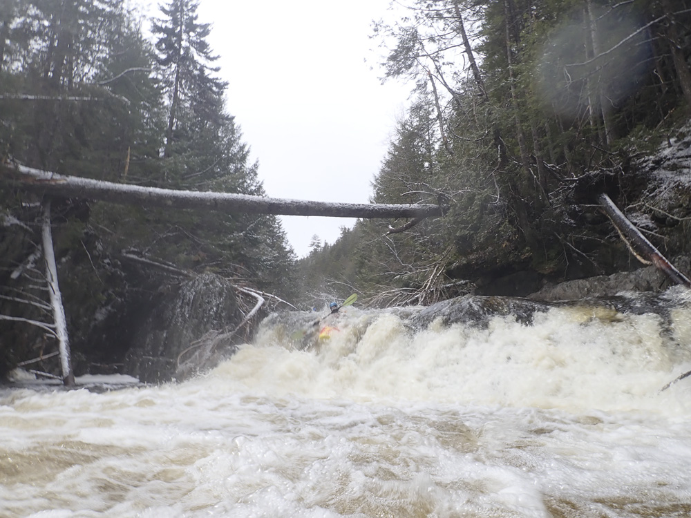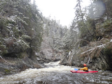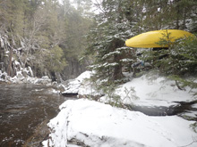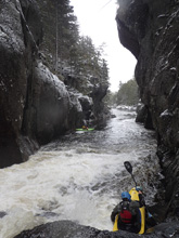 - Wedge (V to P). Nasty nasty nasty. Get out on the right and scout. Most portage. Almost everyone portages below 5" as too much water goes into the sieve you need to boof directly over and slide down the backside of. The lead in is long, but is obviously a bigger rapid so get out before dropping in at all as you portage the whole thing. The portage requires downclimbing directly at the sieve, when it was icy it was scary as a slip would send you right into it. We then climbed down onto the ledge on the right below the drop and seal launched in there.