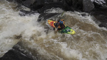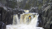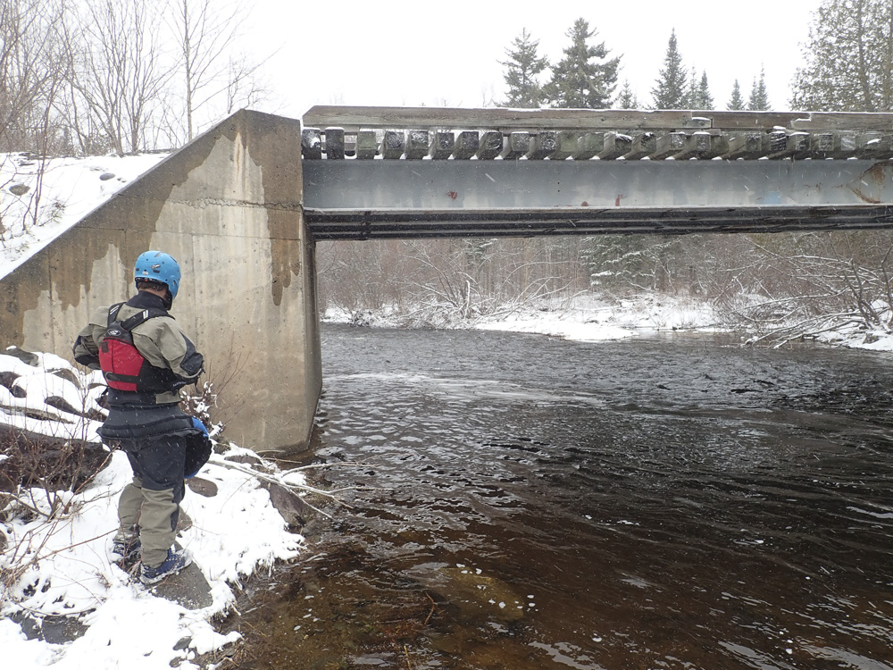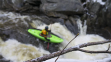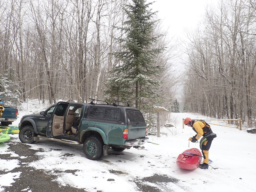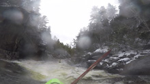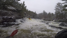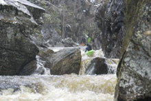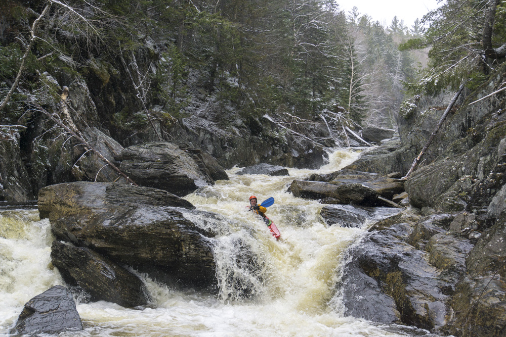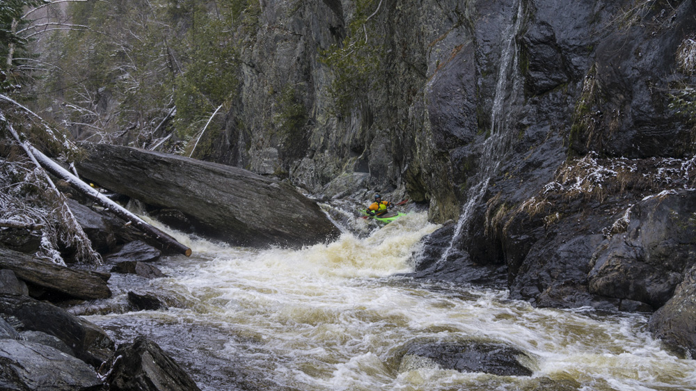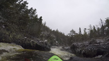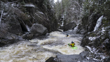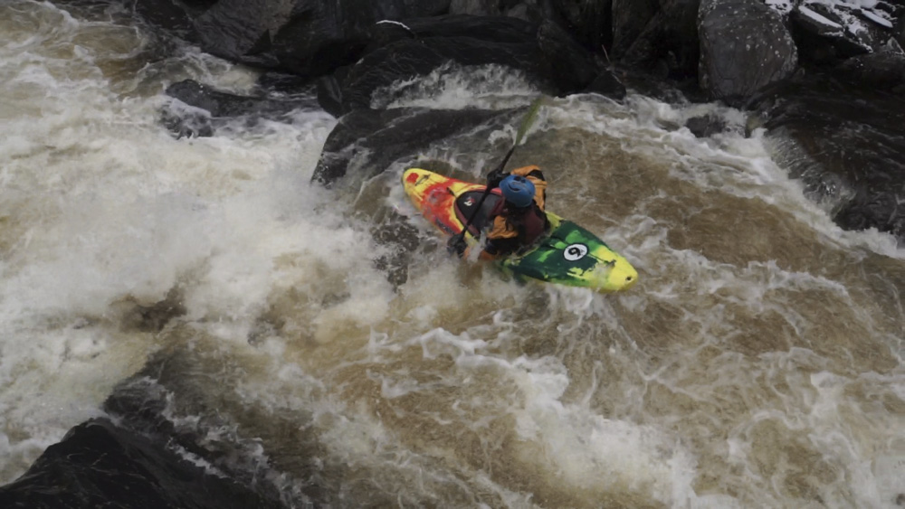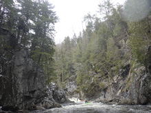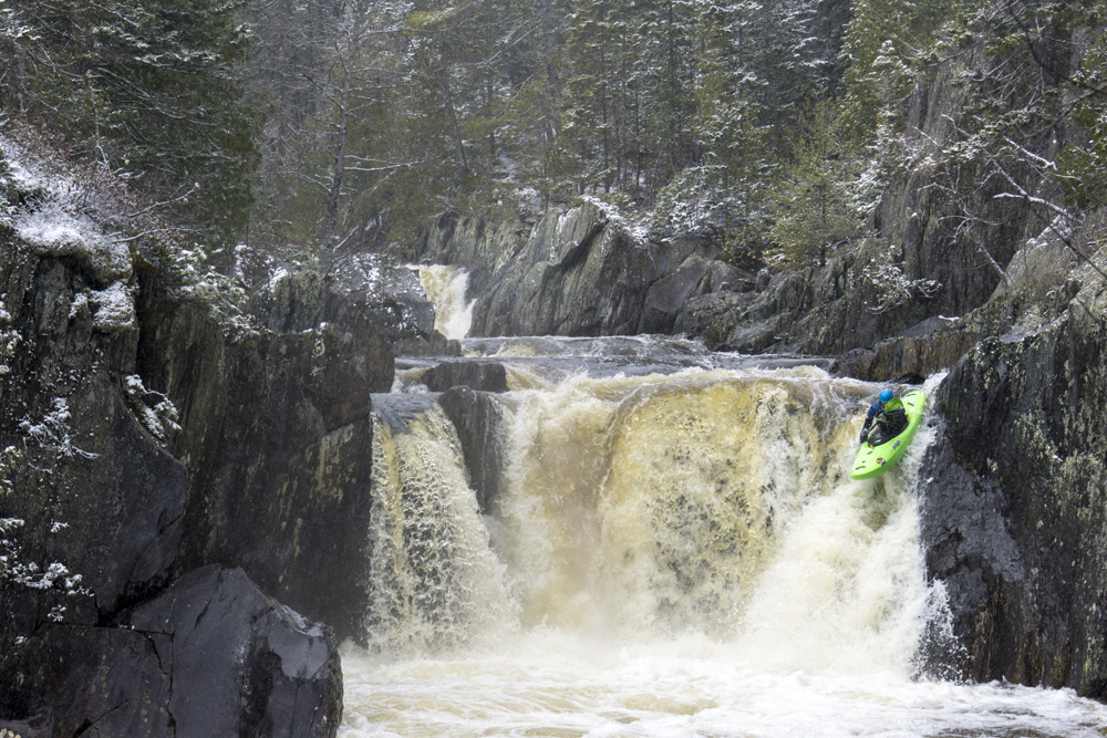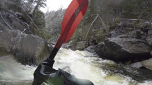 - Wedge (V to P). Nasty nasty nasty. Get out on the right and scout. Most portage. Almost everyone portages below 5" as too much water goes into the sieve you need to boof directly over and slide down the backside of. The lead in is long, but is obviously a bigger rapid so get out before dropping in at all as you portage the whole thing. The portage requires downclimbing directly at the sieve, when it was icy it was scary as a slip would send you right into it. We then climbed down onto the ledge on the right below the drop and seal launched in there.