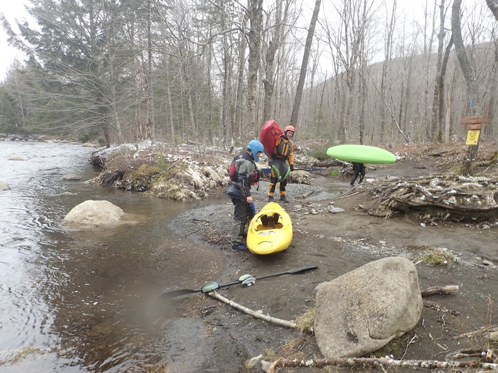 Take-out: 8 miles north of Brownville ME on NE-11 turn left onto the dirt Katahdin Iron Works Rd. Follow this for 6.5 miles to the bridge crossing over the river. Turn right to stay on Katahdin. In another 3.4 miles go left at the fork and quickly cross the river again. Continue for 3.0 more miles and look for the parking area at the trailhead.