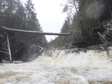 Dead Moose Falls (III+ to IV-). A nice 6 foot ledge best run on the right side of the main left channel. As you drop over you get a wonderful view of Stair Falls re-entering coming in on the left just below.