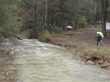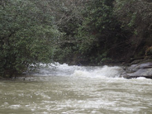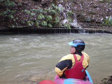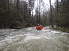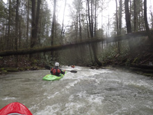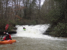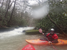 The first slide is a bit of a clapper that we ran down the right. A small ledge after that leads you to the biggest drop. This long drop is not a place to be upside down! We started left and head right down and around the corner. It is twice as long as Triple Drop on Little Clear Creek and drops at a similar gradient. Below this rapid, a few more smaller drops greet you before you are deposited into the Emory River. The Emory will be very high if this is running so you make very quick time through the half mile down to the take-out.