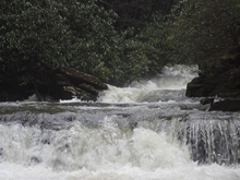 Magic Carpet Ride (IV to IV+). The main event on this run. This drop we entered left and worked right. It starts with a steep slide which then narrows before going over a non-vertical waterfall of maybe 8 feet tall. This then goes into a few more small ledges. Overall, a really fantastic rapid. I think scout left if you were going to.