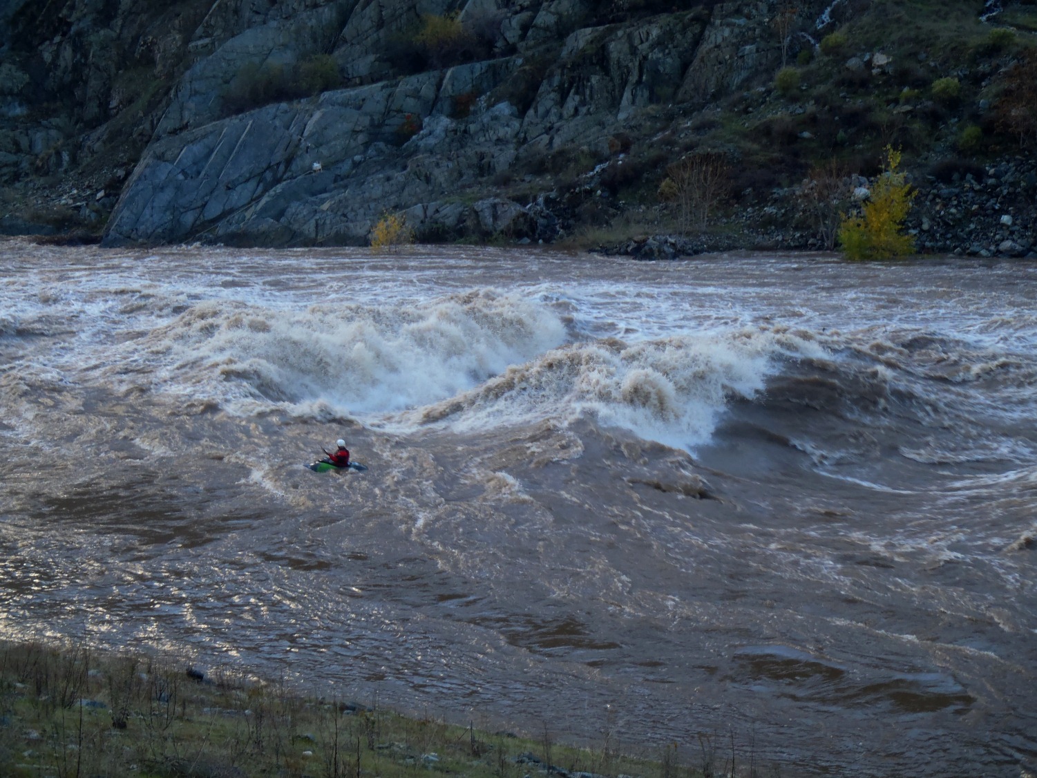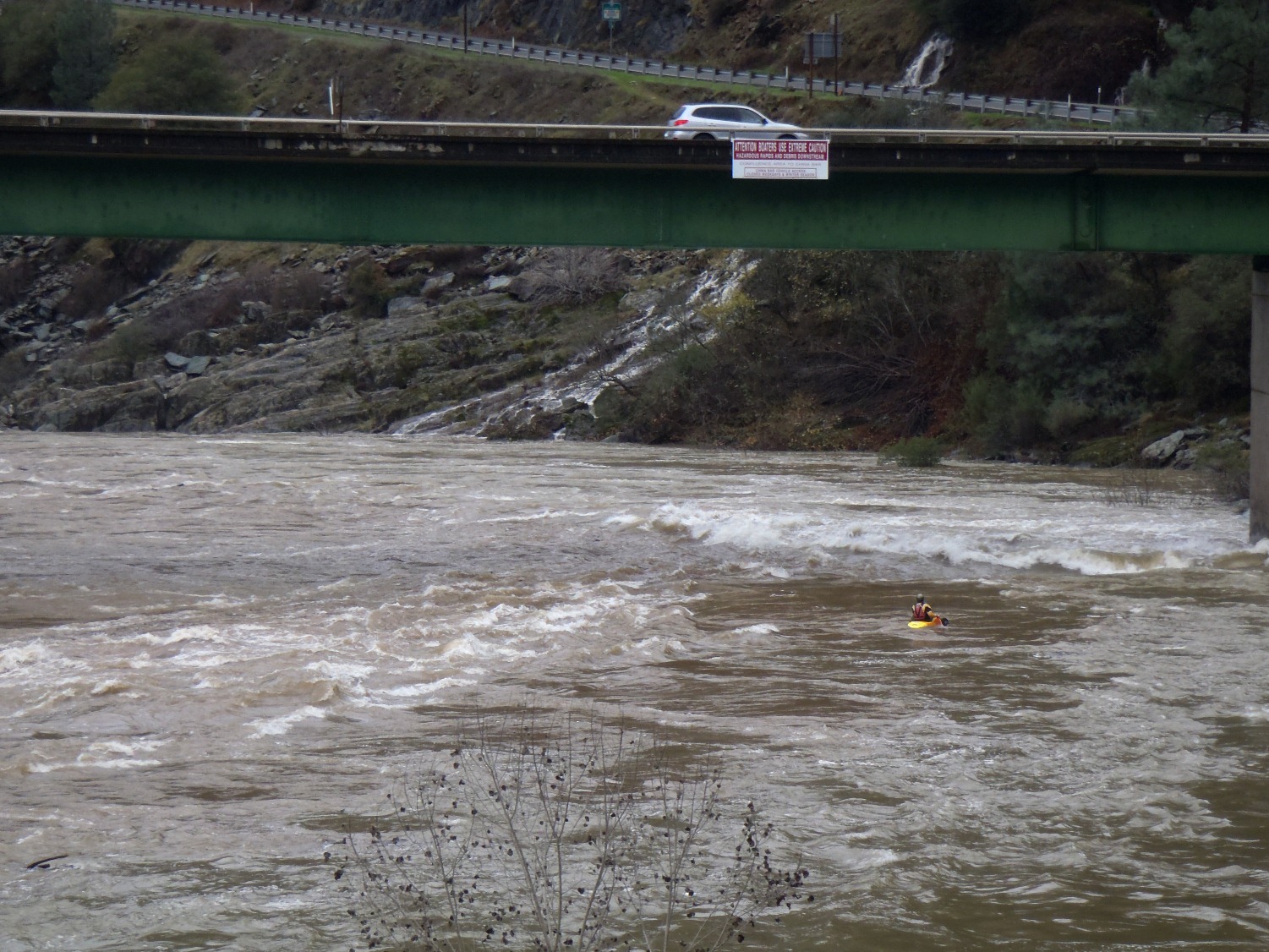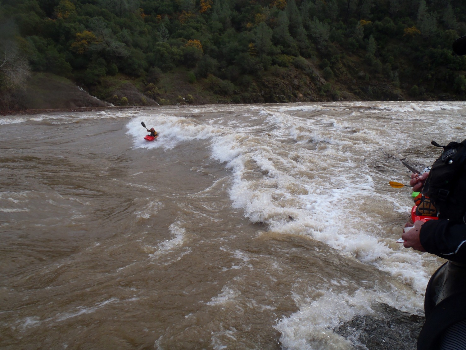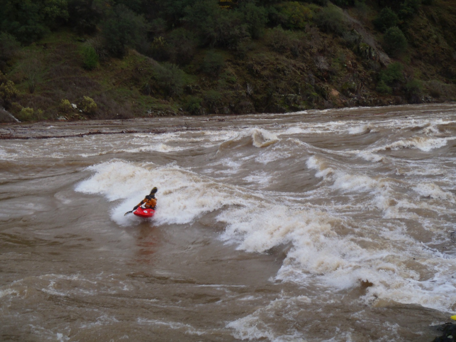 So, this river is class II at normal flows. Probably a great beginner, or inner tube run during the heat of the summer and low flows provided by the dam release on the Middle Fork. However, a few times every few years, the river rages and California gets its only (that I am aware of) big wave feature to surf on. 25,000 cfs is the idea flow, with lower flows creating a sticky hole and higher flows creating a glassy wave that is flushy.