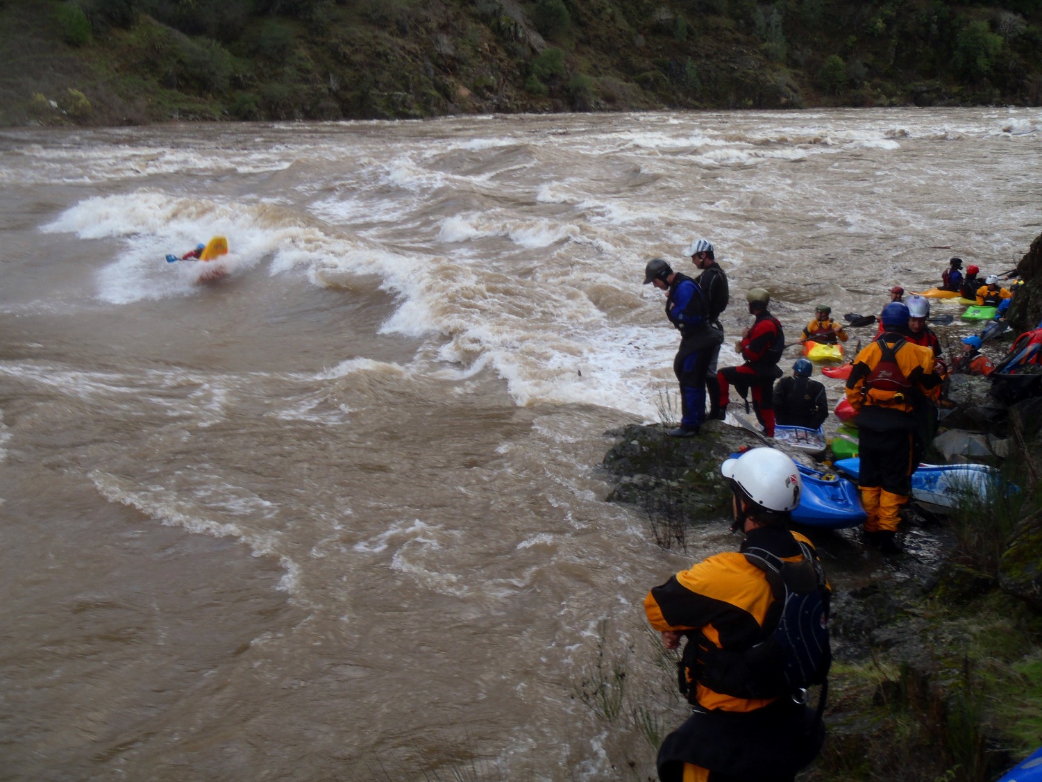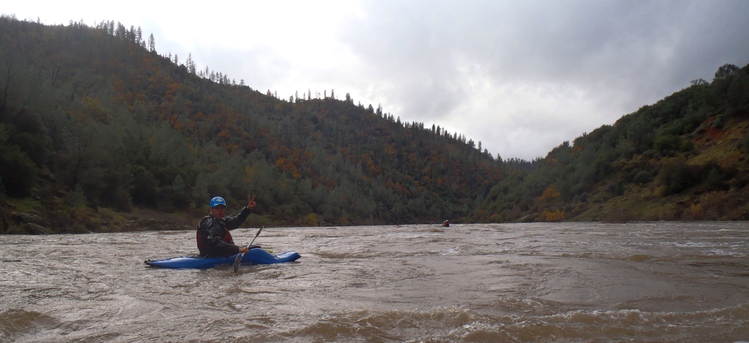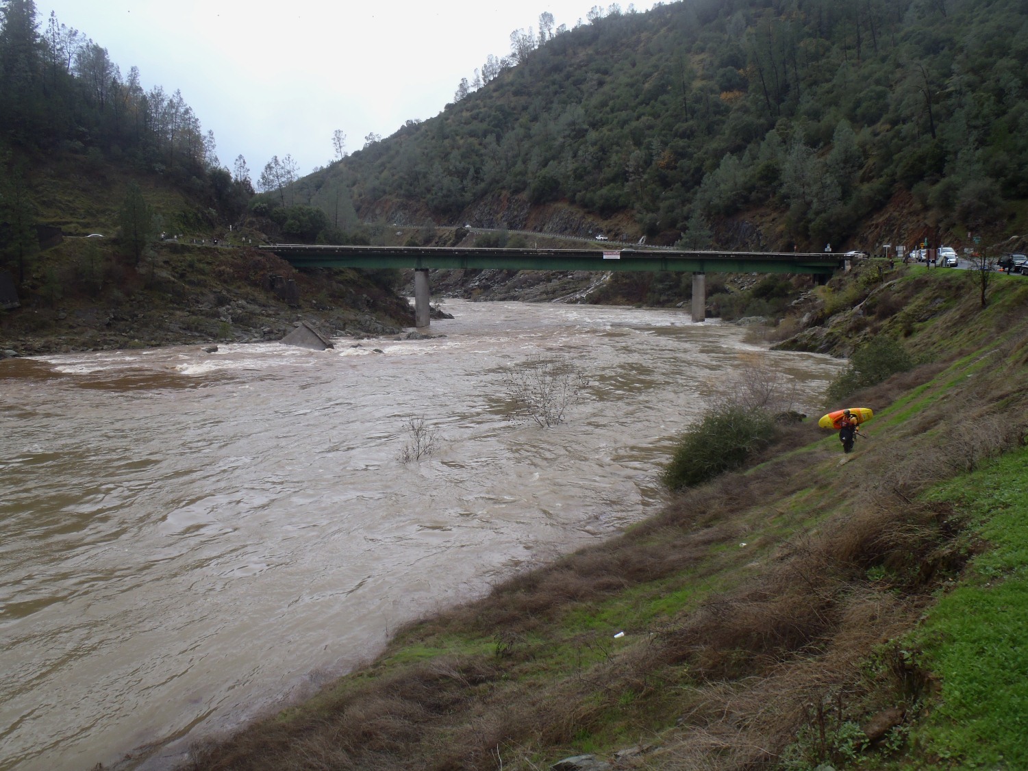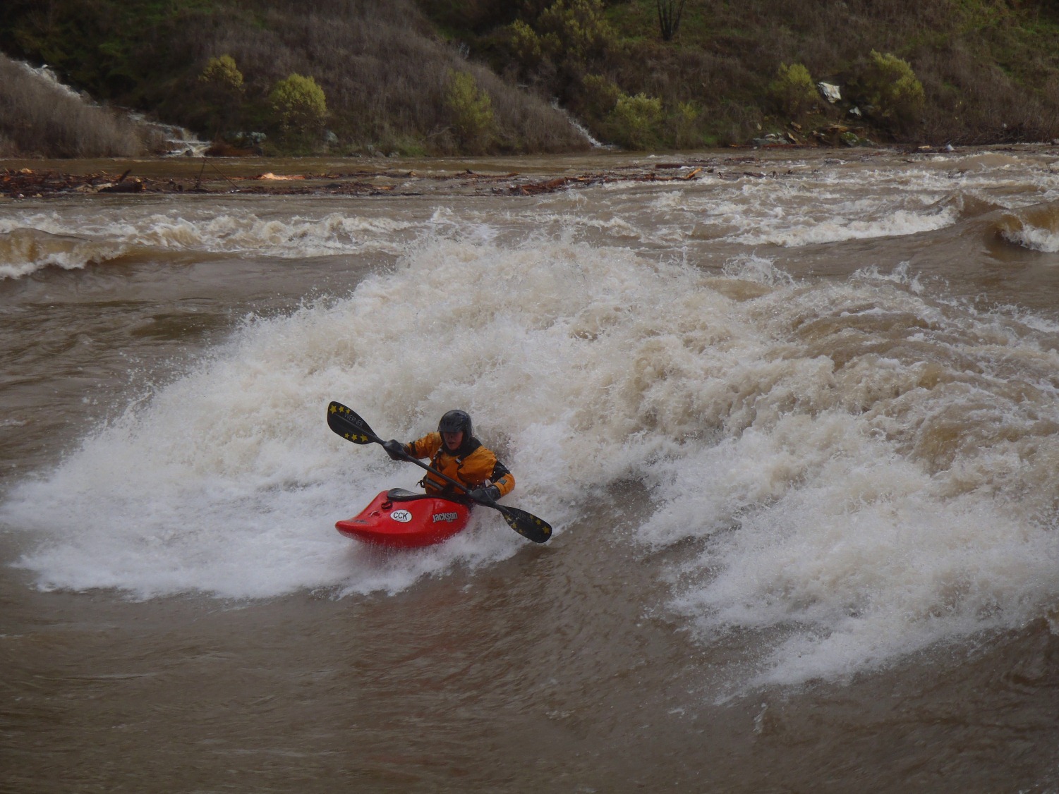 So, this river is class II at normal flows. Probably a great beginner, or inner tube run during the heat of the summer and low flows provided by the dam release on the Middle Fork. However, a few times every few years, the river rages and California gets its only (that I am aware of) big wave feature to surf on. 25,000 cfs is the idea flow, with lower flows creating a sticky hole and higher flows creating a glassy wave that is flushy.