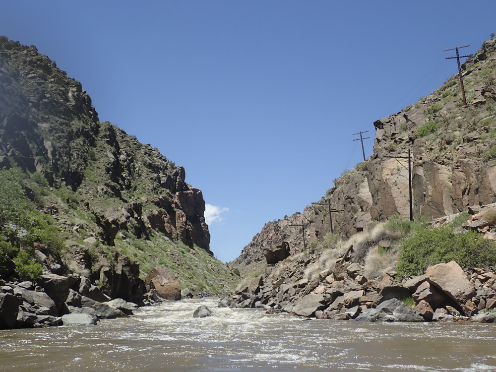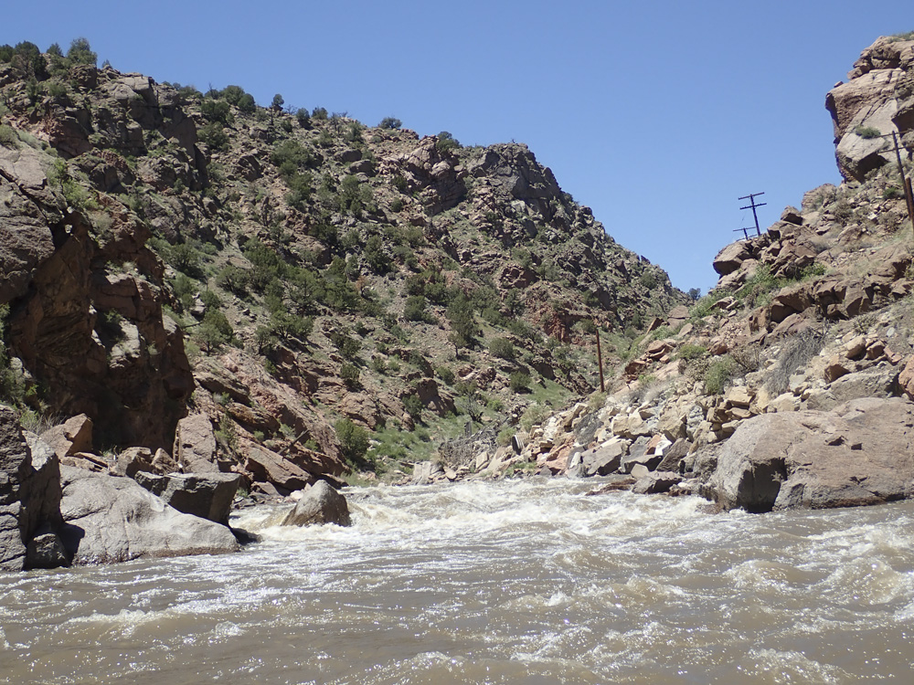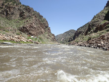 Lower Narrows (III-). These rapids all have names in typical rafting company fashion. But I do not know them. But the walls stay tight, you get some nice long rapids, and eventually the river bends right.