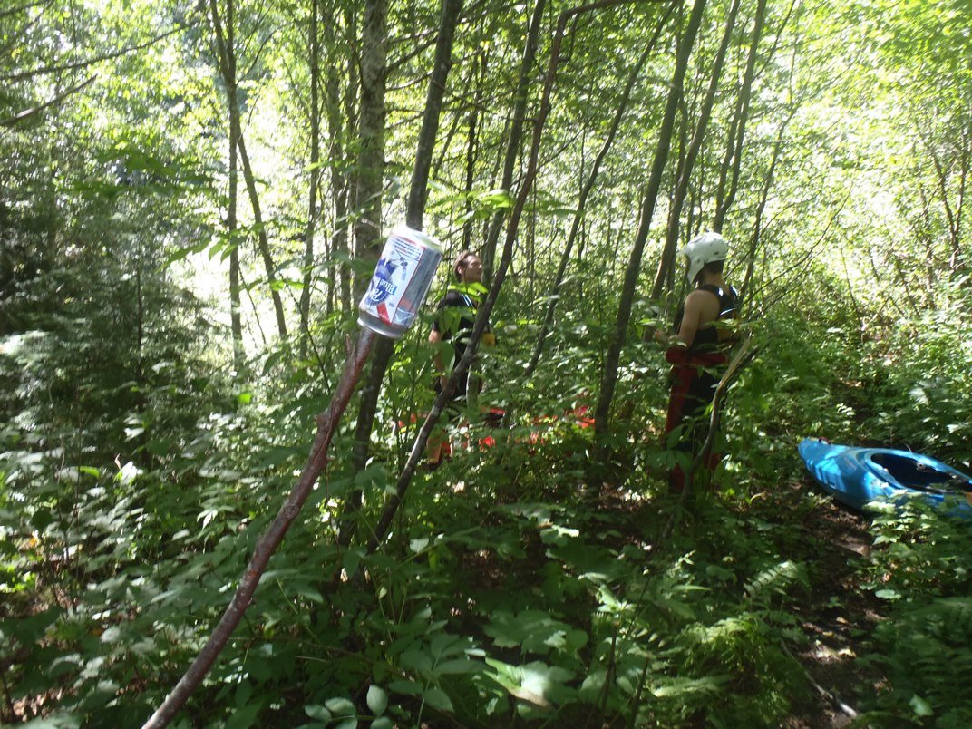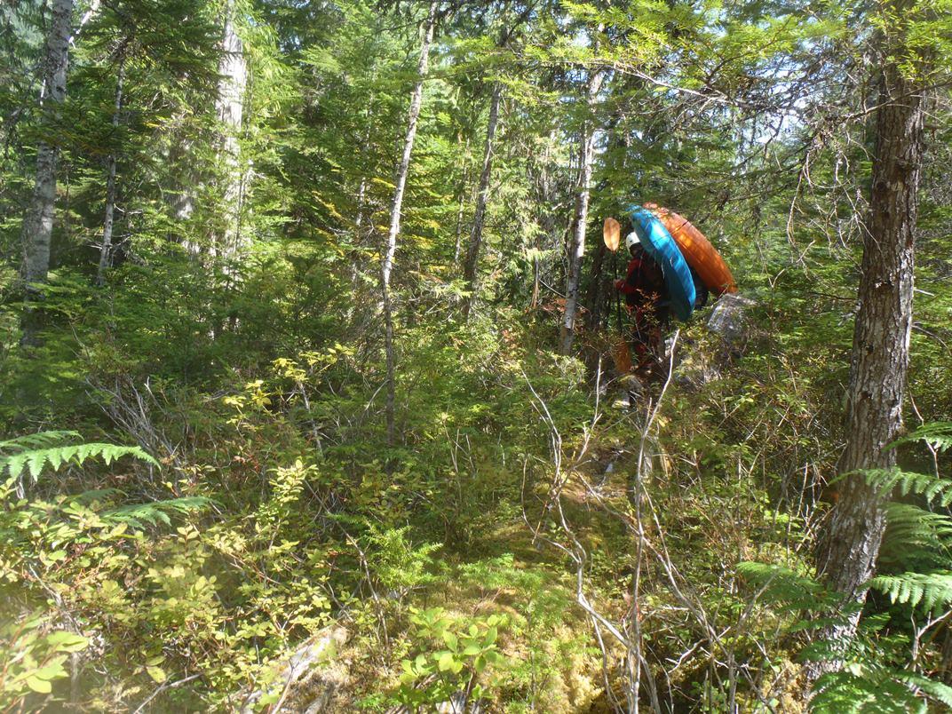 - Portage (V++). Climb up the creek bed about 50 feet and then claw up the dirt edge to a vague trail. Follow this for a few hundred yards. Eventually, you will find some fixed ropes to aid in the down-climb back into the canyon. This portage took about 20 minutes and was a complete bushwhack. The rapid itself was a pinch into a pour over hole into a boiling eddy where the exit was blocked by a side current flowing into an undercut. The only exiting water seemed to be on the surface. It looked very dangerous... you 100% would not want to be in the lead of your group dropping in. I do not know if it has been run, but I am sure they had ample safety set there if they did.