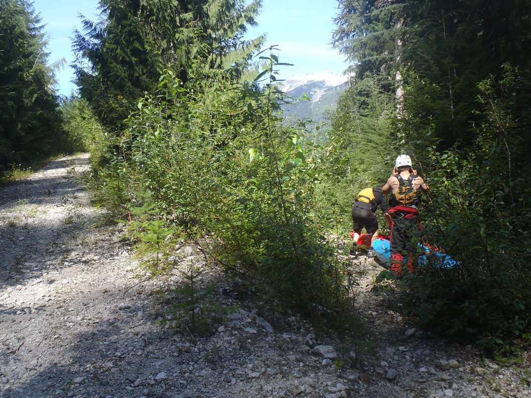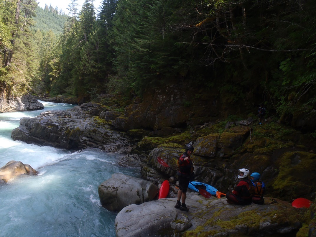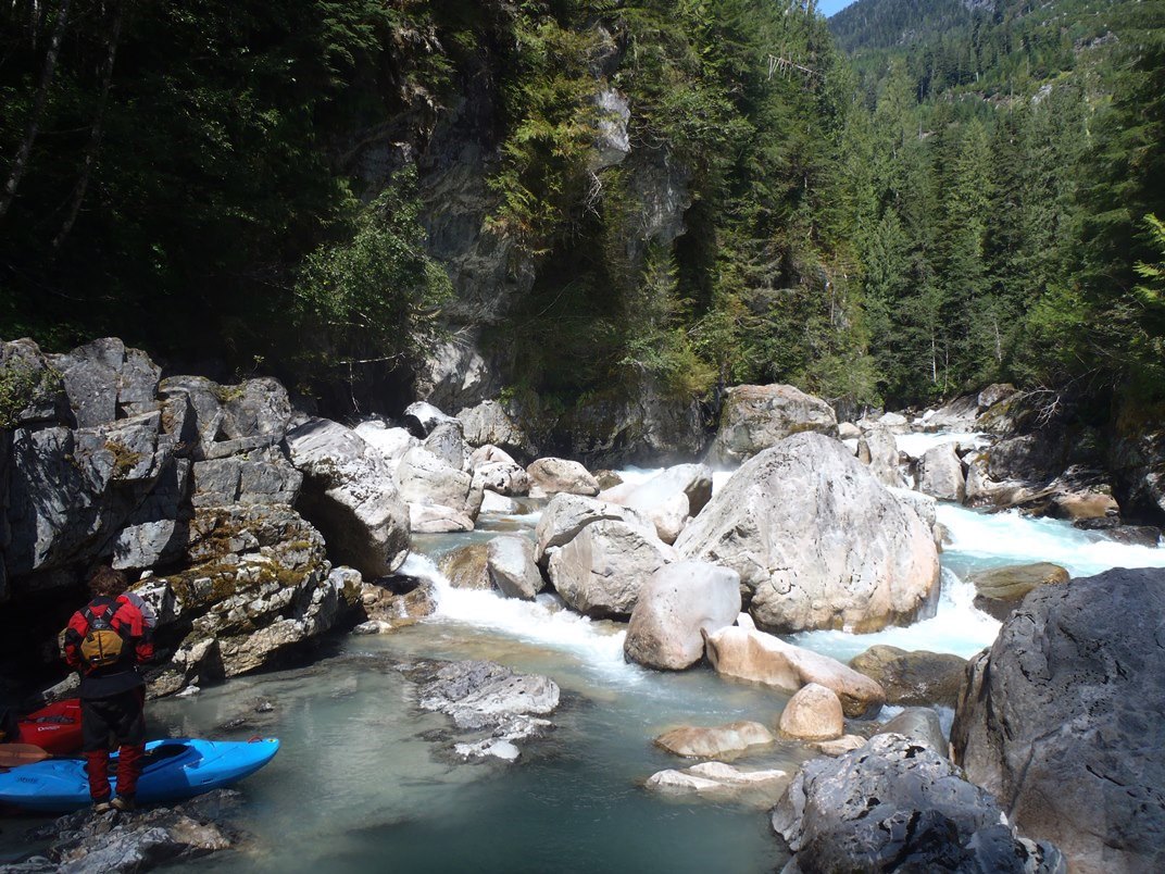 Ashlu's Mine run is certainly less famous than its downriver brother, the Box Canyon. But Ashlu offers some nice rapids in a similar, though less committing, box canyon. We put in at the Mine Rapid via river right. The irony is that the bottom half of the put-in rapid is one of, if not the, biggest rapid of the run... no warm up here. Below, several big, fluffy, and fun rapids continue down to a portage. The portage is long, maybe 20 minutes, and requires you to ascend up a dry creek before bushwhacking around a canyon, before then repelling (rather, using rope aid) down to the bottom of the portage. The portage rapid looks like one that would drown you for sure. A big hole leads to a bowl where the only water exiting appears to be under the surface. There is an eddy at the lip that would make this a 2 minute portage... but it looked super sketchy and is usually not taken. Below the river quickly opened up.