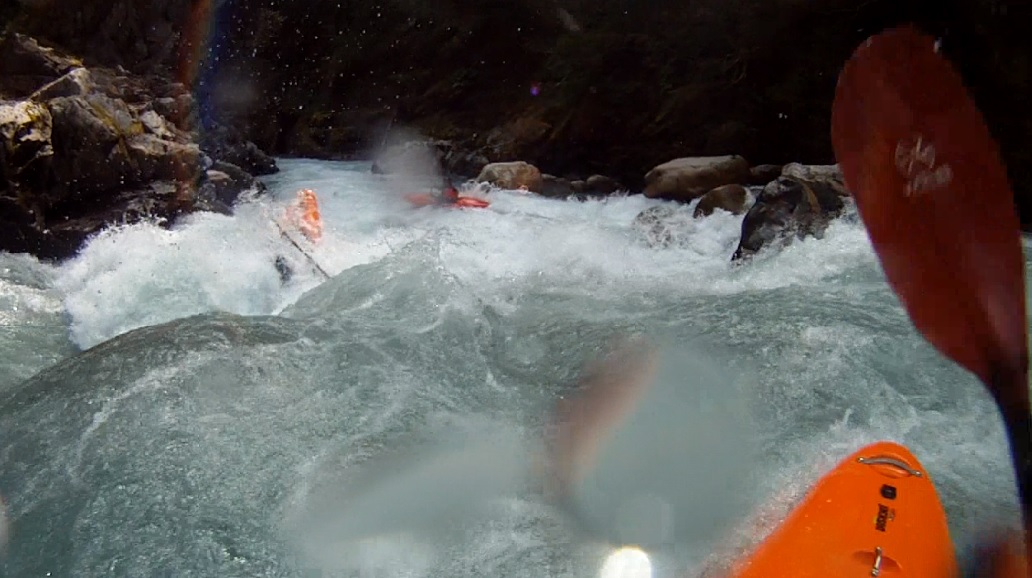 Everyone Flips (IV+ to V-). The idea is to run center moving right... hard right. The middle has a rock. The problem is the right has a big curler coming off the wall before dropping into an off angle hole. Everyone in our group flipped... other than me who was the only person who got pushed center and while bracing for a massive piton was surprised by a rather large boof over the hole. Total luck though... Scout left.