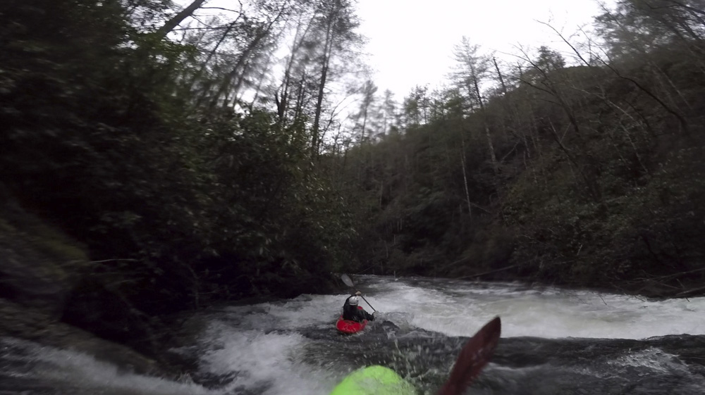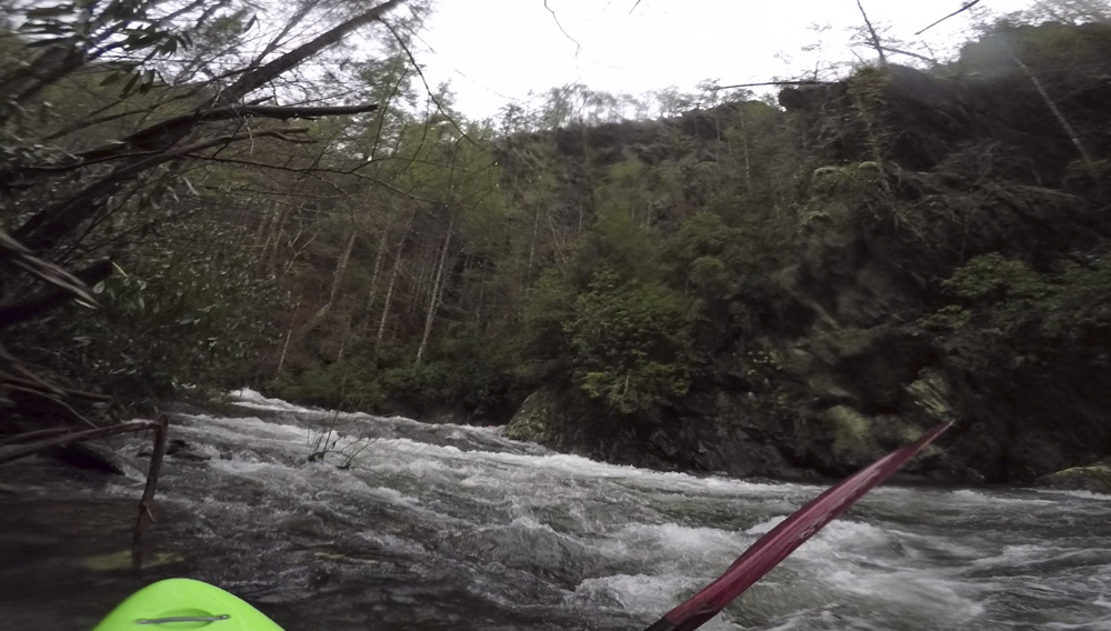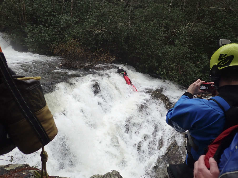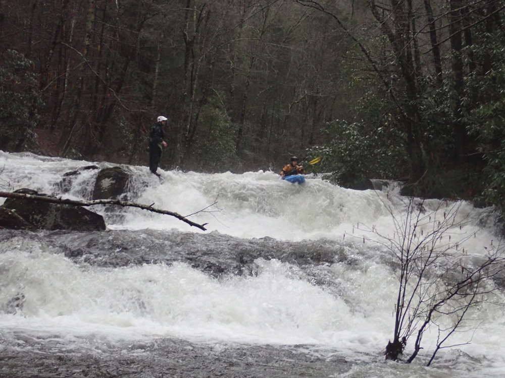 Finally, the river begins to open up and you start to get some nice rapids. These rapids pick up steam until you are at the top of Shallow Falls. Shallow Falls is an easy enough boof on the left, but 1) it had wood in it and 2) it pushes immediately off the very stout Suislide immediately below. There is only 40 ft of fast moving water and no real eddy between them. Scout thoroughly! If you run the Shallow Falls, find a way to beach your self on the left, and wade down to the lip of Shallow falls and portage down the middle steps, in the side current. We portaged both, using a steep hillside 20 feet downstream of a spur that can be used from the main trail to scout the falls. This put us in at the base of the falls. It looked too steep but in fact was totally ok.