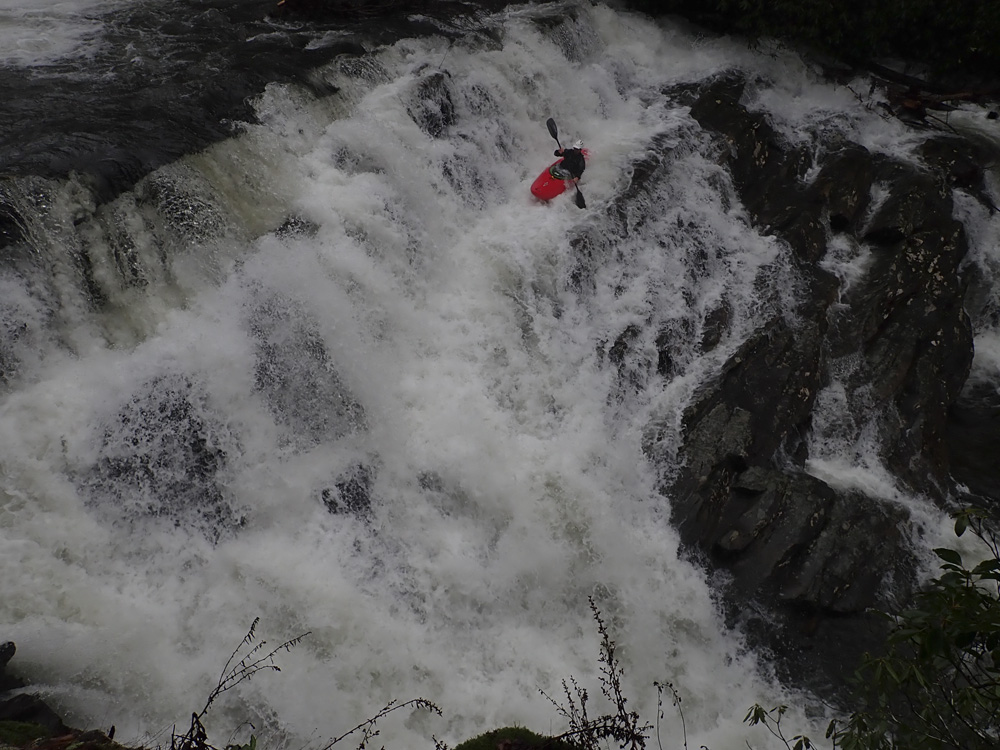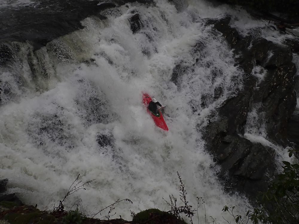 Suislide (V+). Most commonly portaged. If you run the falls immediately upstream, you will need to get out in moving water on the left, and then portage down the left of center part of the rapid... in the current. You can run the bottom half from there if you want, down a grove and into the main current where you would boof the bottom ledge against the wall. Or, if you portage both falls you can drop down the hill side steeply 20 feet downstream of the well traveled spur that we used to scout. With a tether, you didn't even need to rope boats.