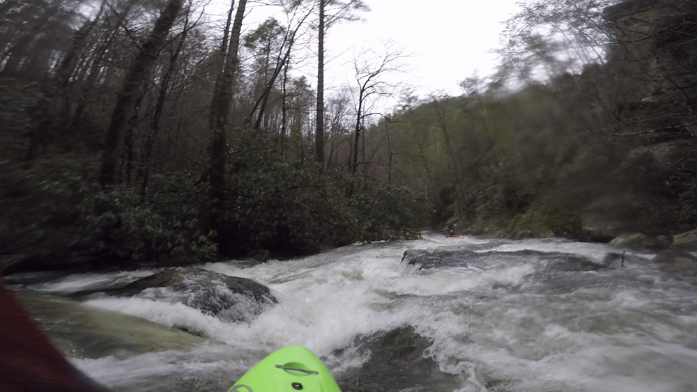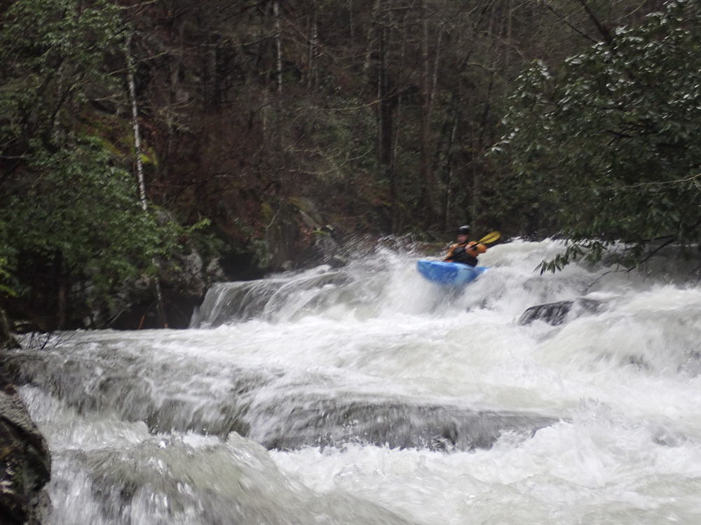 Slides and Ledges (IV). Several nice slides and ledges above the take-out. We ran the first ledge on the left. We then ran the next slide on the right boofing over the hole at the bottom. Those that tried to slide around the hole, just ended up flipping it in. Just embrace the full hole and hit the pad to boof the meat of it. One last little rapid occurred down the right wall which led to the eddy above Bald River Falls, and our take-out.