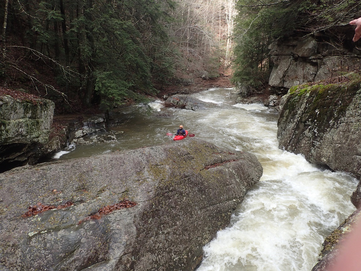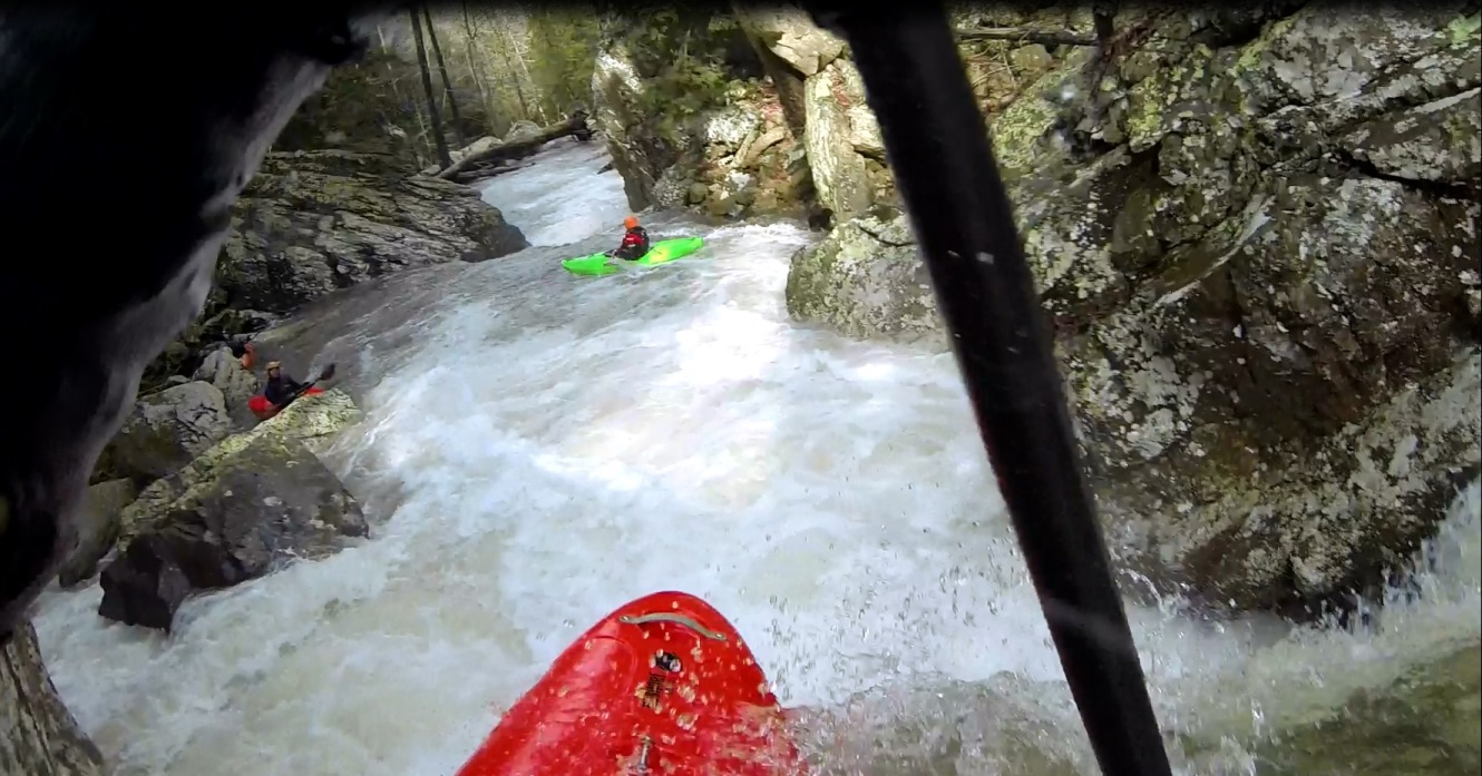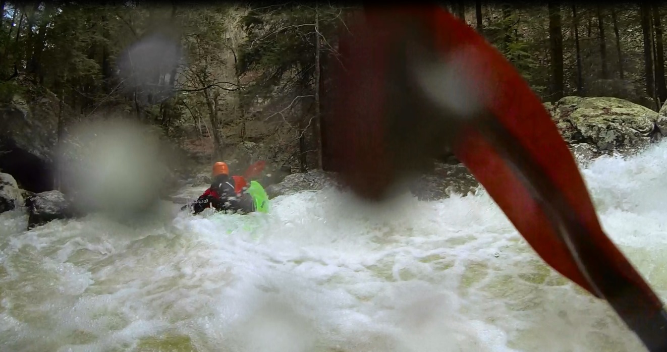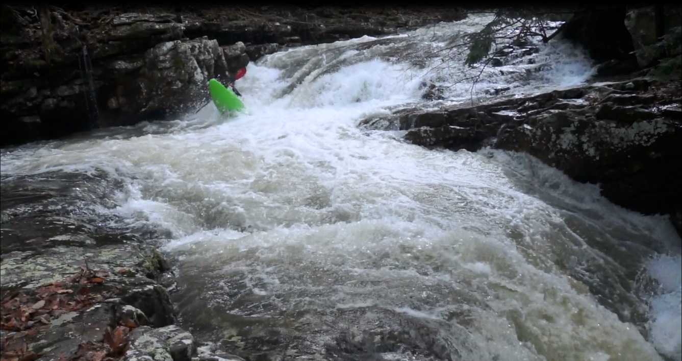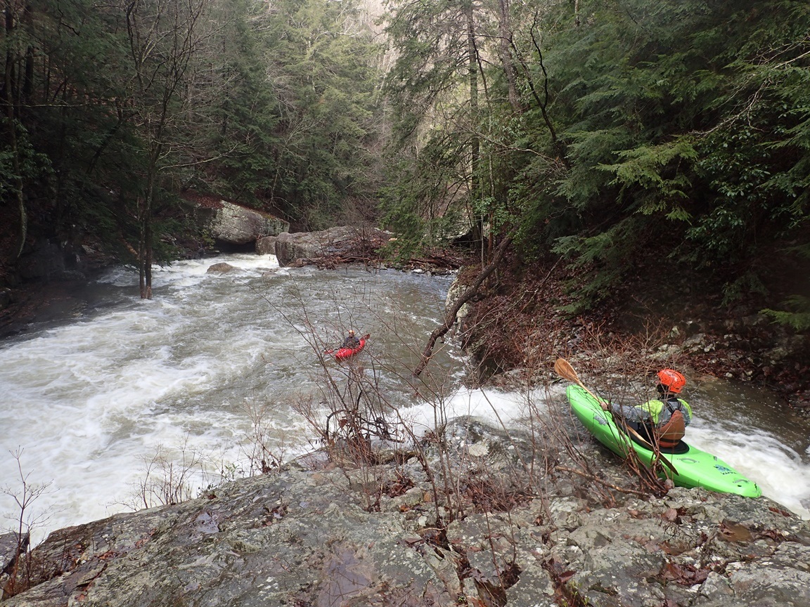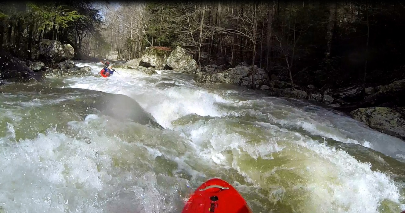 Armageddon (V). One of the more well-known drops of the run, this drop packs plenty of consequence in its gradient. Early 2015 we had to portage some wood in the lead in rapid. It was pretty obvious, and that part of the rapid was junky anyways. From there, ferry across to start in the river left eddy above the lip. Ferry to the right eddy where you can properly drive to the far left. From the eddy, ferry behind a large rock and boof far left into a small 1.5 boat eddy. Whatever you do, do not go down the far left channel, it is sieved and full of wood. Instead, ferry out 5 feet into the middle channel and slide down the left side of the small channel into a hole. Then eddy out far left immediately again. The exit is down the far right, enter right early and grind a rock to boof and stay right, below there are a few small ledges to navigate, just stay right and you are done with the rapid.
