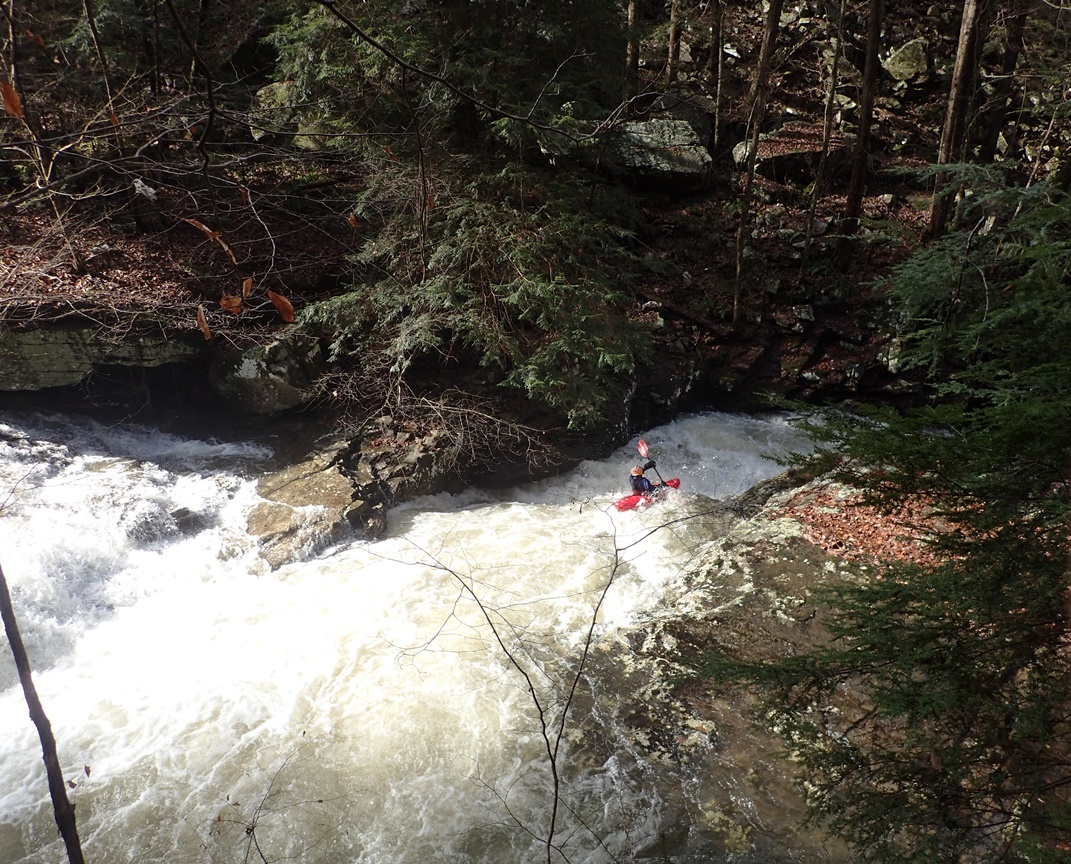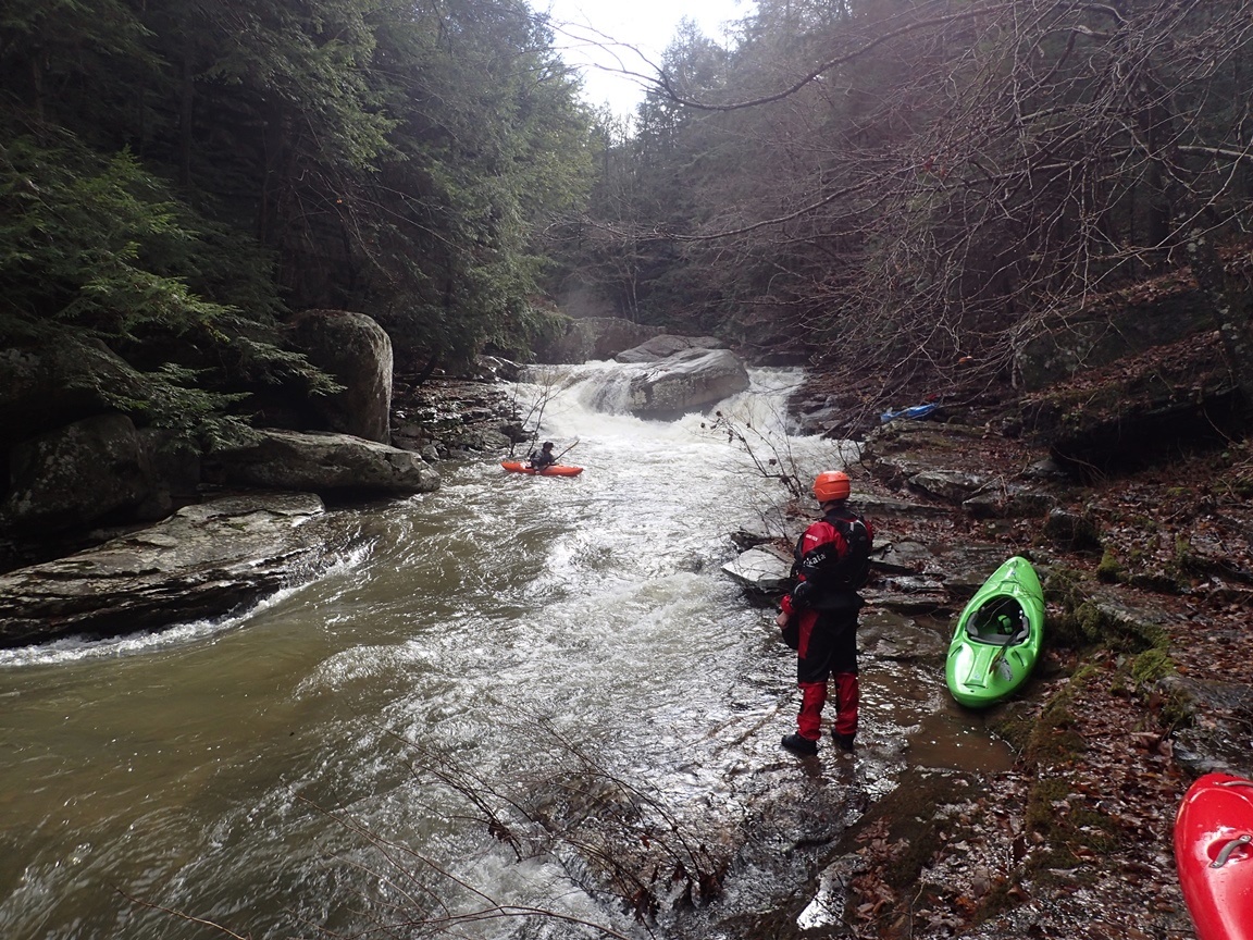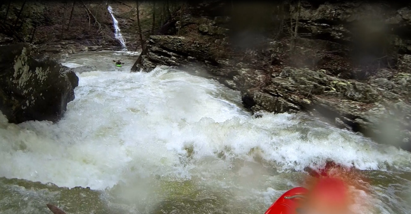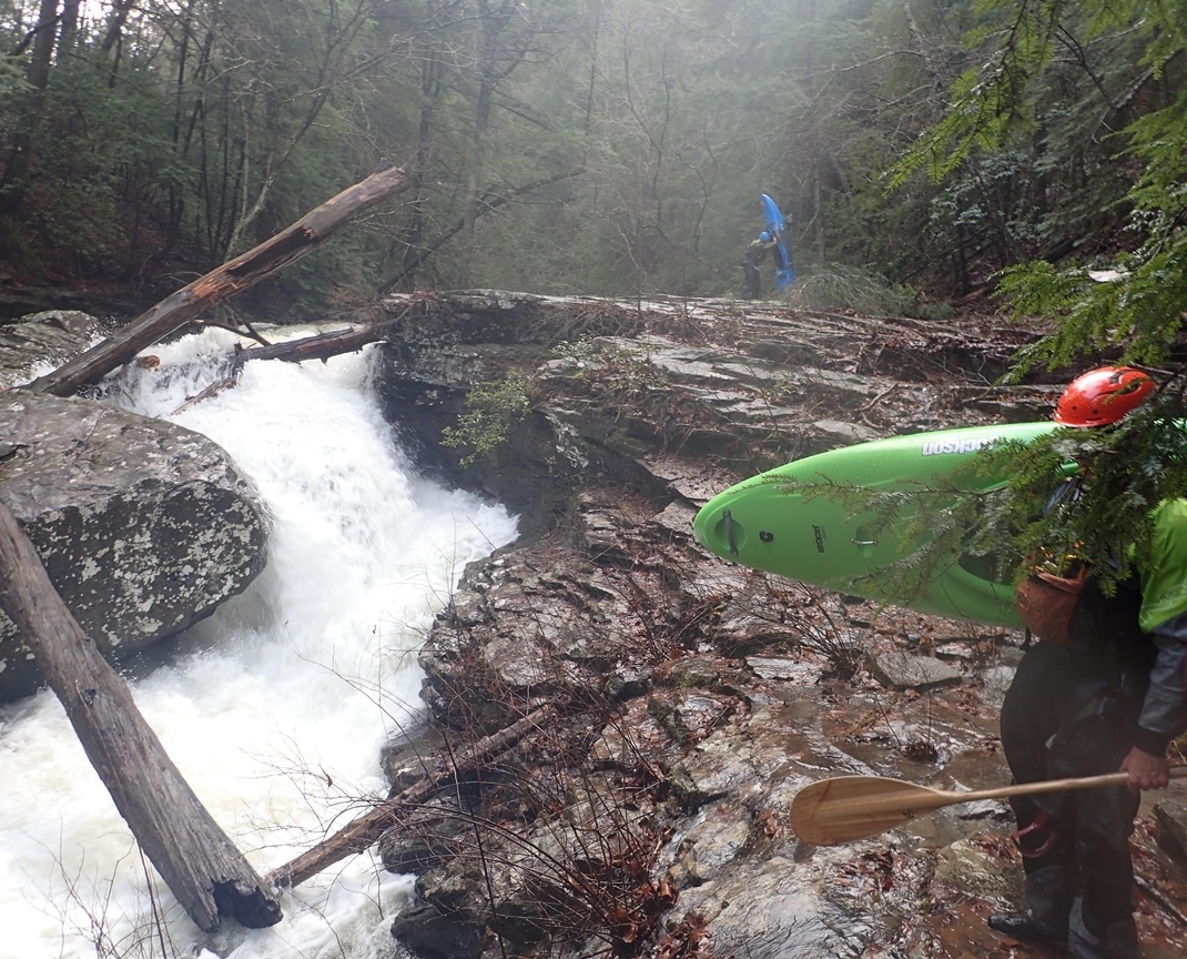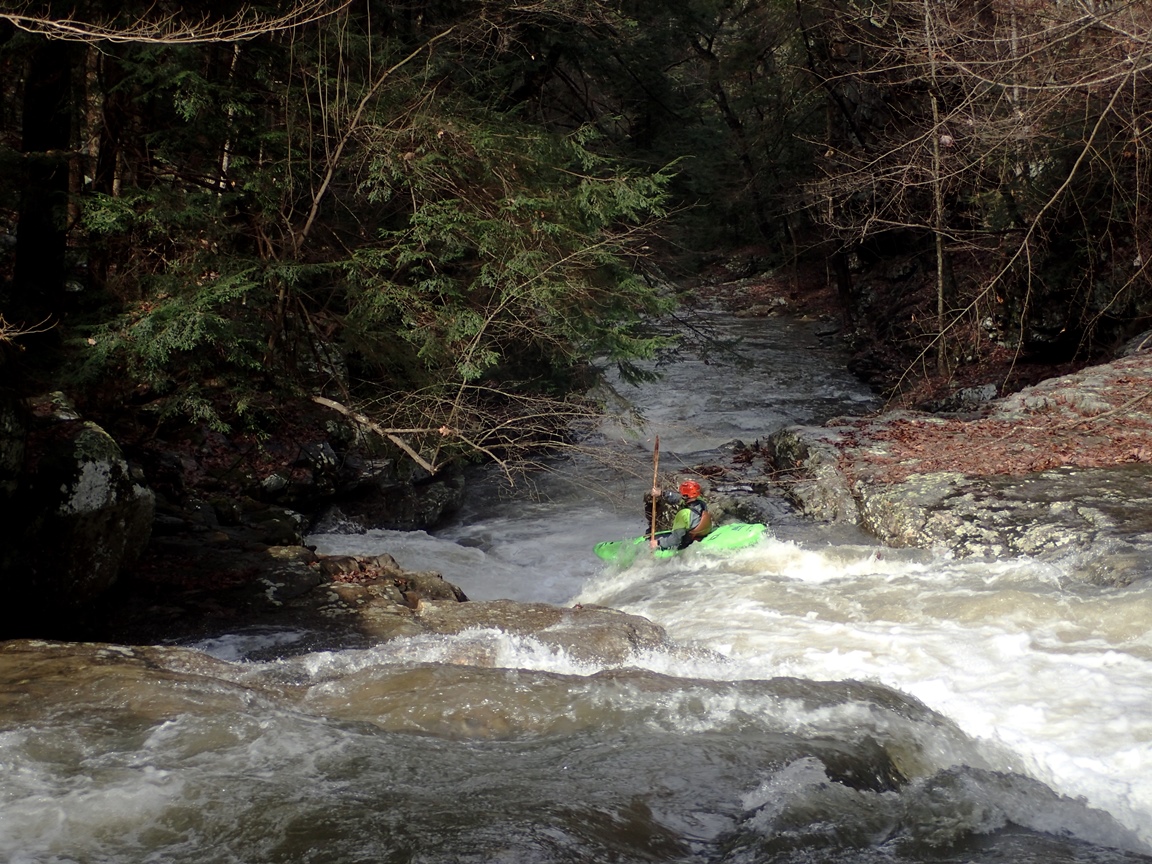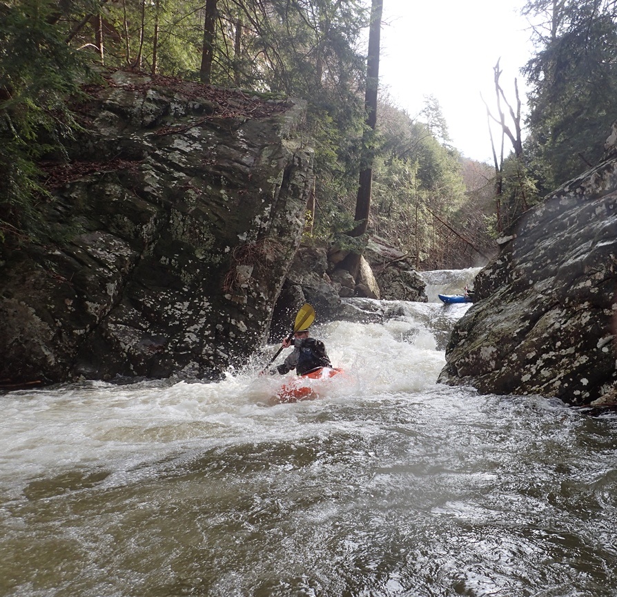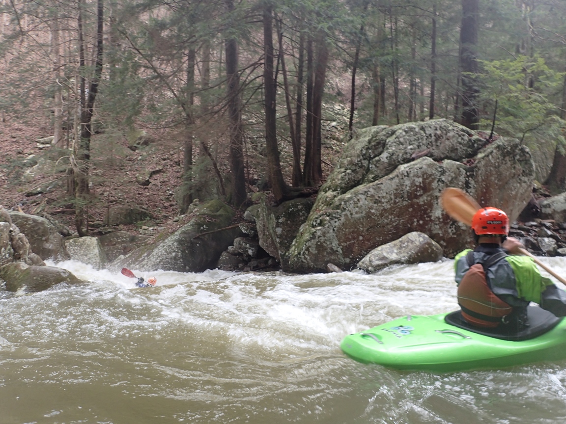 Armageddon (V). One of the more well-known drops of the run, this drop packs plenty of consequence in its gradient. Early 2015 we had to portage some wood in the lead in rapid. It was pretty obvious, and that part of the rapid was junky anyways. From there, ferry across to start in the river left eddy above the lip. Ferry to the right eddy where you can properly drive to the far left. From the eddy, ferry behind a large rock and boof far left into a small 1.5 boat eddy. Whatever you do, do not go down the far left channel, it is sieved and full of wood. Instead, ferry out 5 feet into the middle channel and slide down the left side of the small channel into a hole. Then eddy out far left immediately again. The exit is down the far right, enter right early and grind a rock to boof and stay right, below there are a few small ledges to navigate, just stay right and you are done with the rapid.
