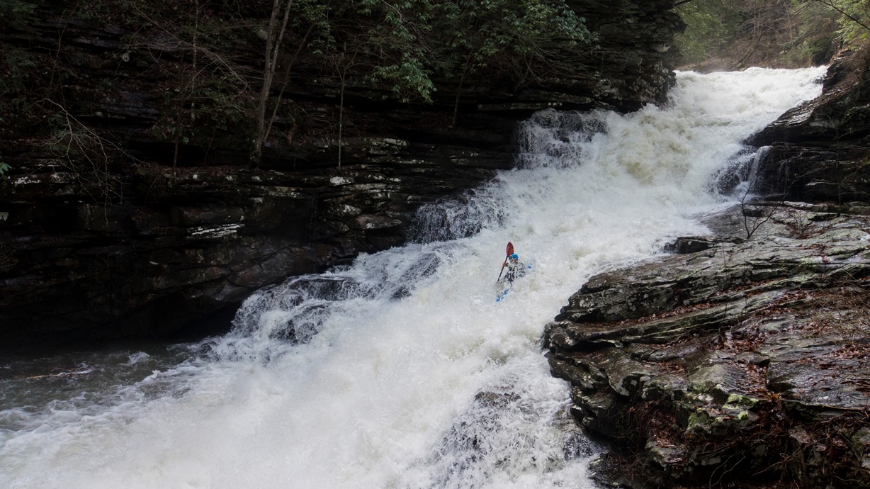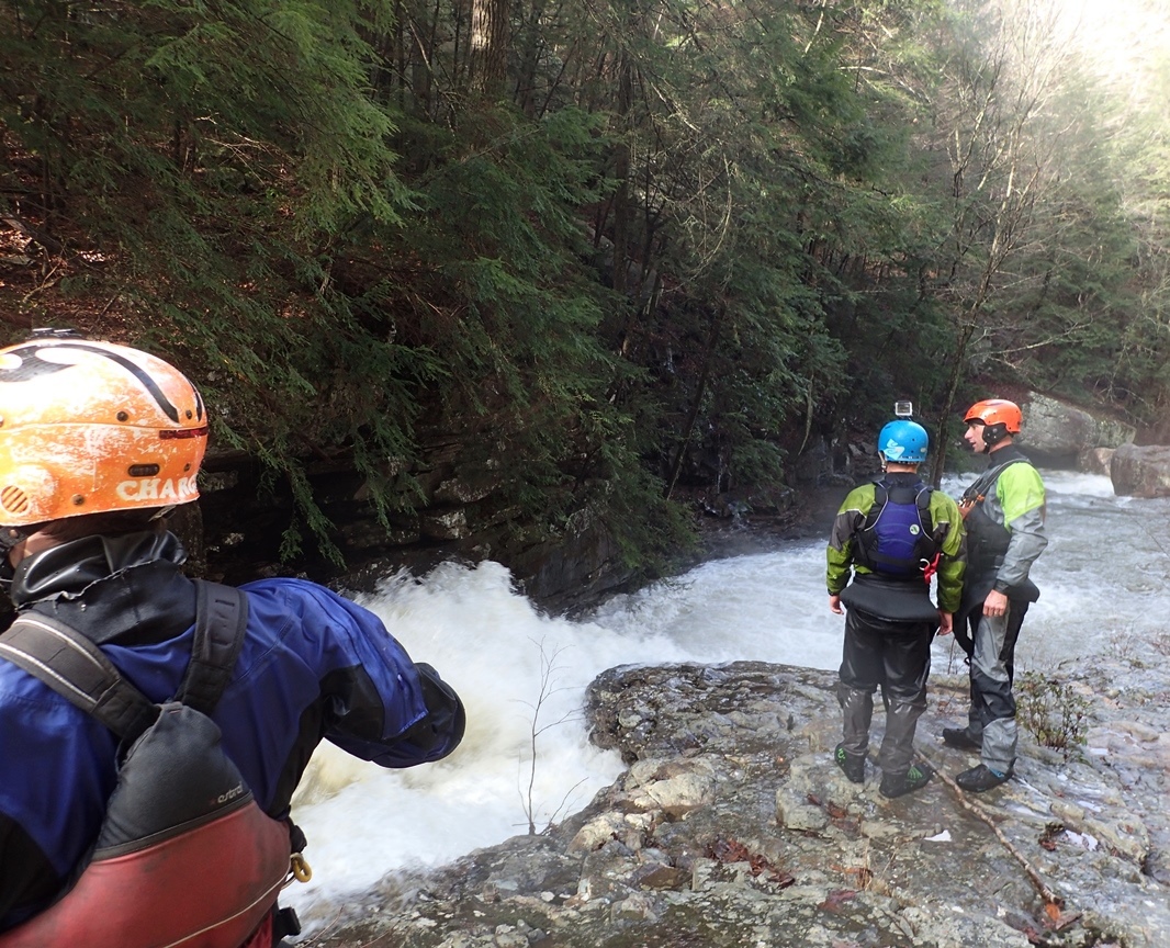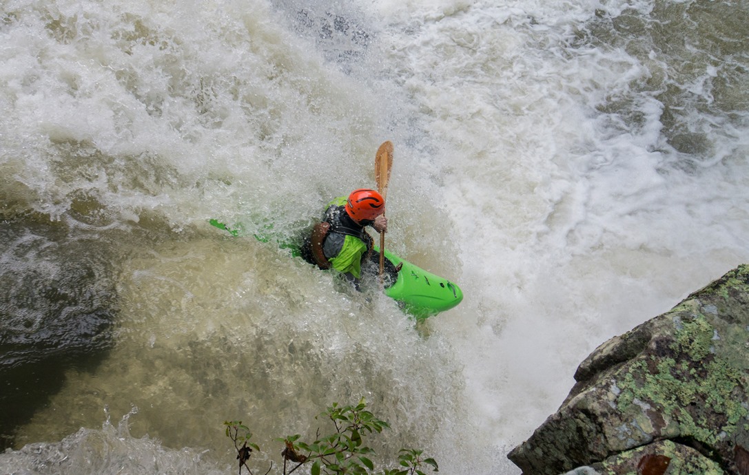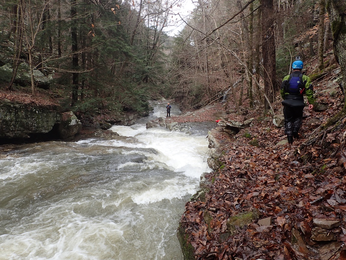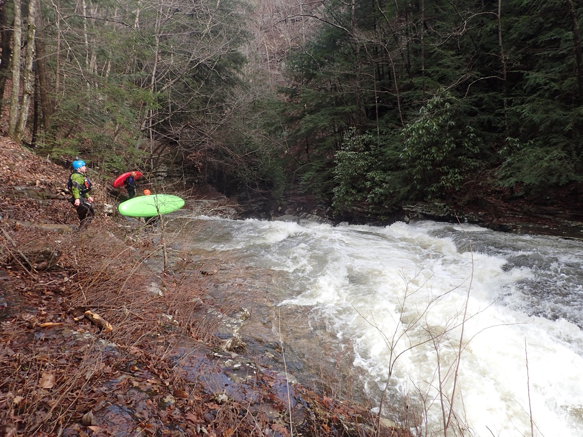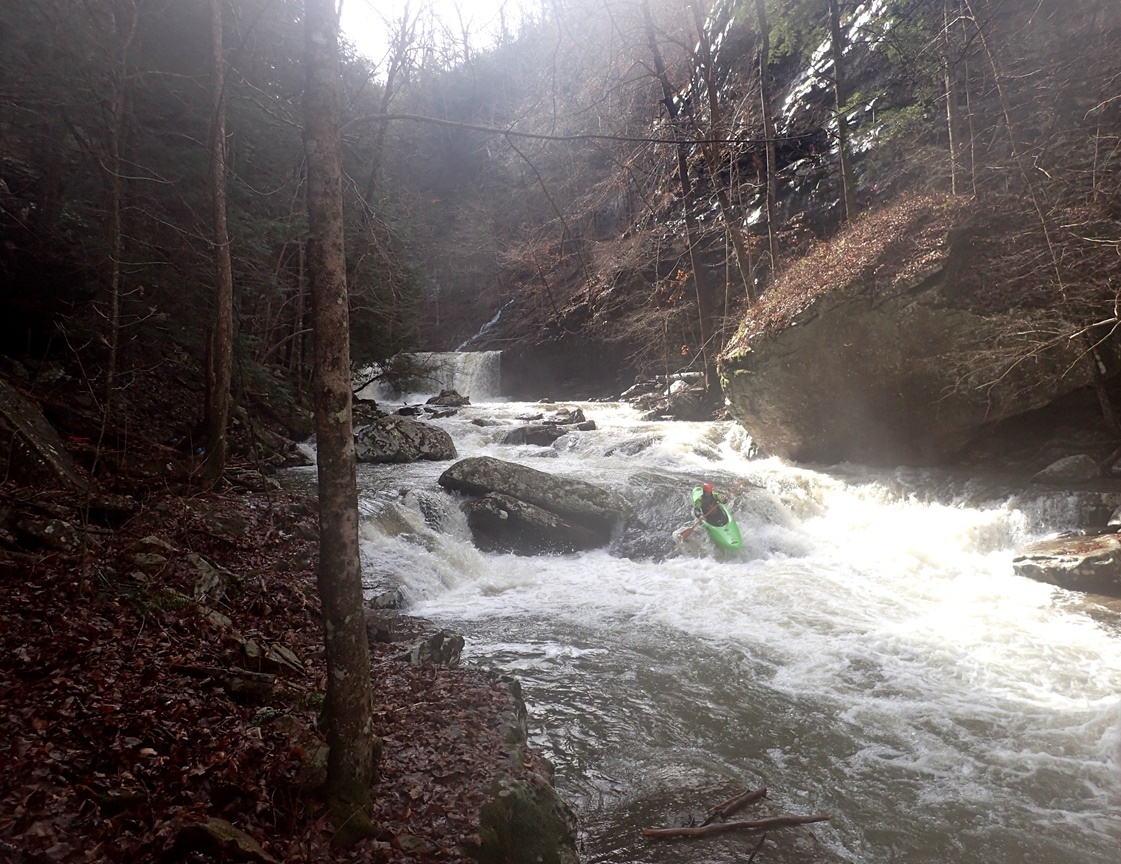 Armageddon (V). One of the more well-known drops of the run, this drop packs plenty of consequence in its gradient. Early 2015 we had to portage some wood in the lead in rapid. It was pretty obvious, and that part of the rapid was junky anyways. From there, ferry across to start in the river left eddy above the lip. Ferry to the right eddy where you can properly drive to the far left. From the eddy, ferry behind a large rock and boof far left into a small 1.5 boat eddy. Whatever you do, do not go down the far left channel, it is sieved and full of wood. Instead, ferry out 5 feet into the middle channel and slide down the left side of the small channel into a hole. Then eddy out far left immediately again. The exit is down the far right, enter right early and grind a rock to boof and stay right, below there are a few small ledges to navigate, just stay right and you are done with the rapid.