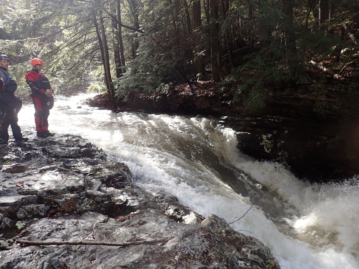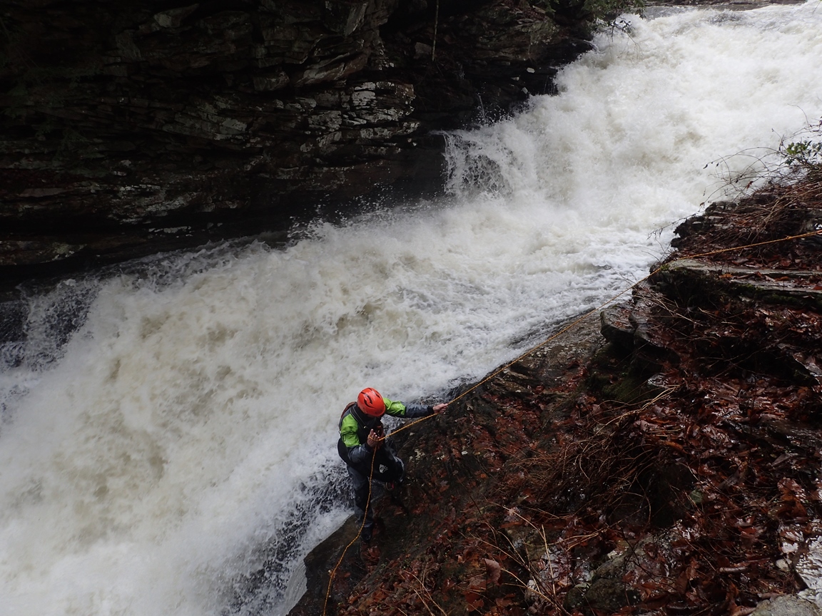 Big Bang (IV+). A straight forward, but consequential 18 footer. The landings in the middle and left of the right channel are shallow. So you want to go off the right side of the small launch flake moving right to find the deep water.