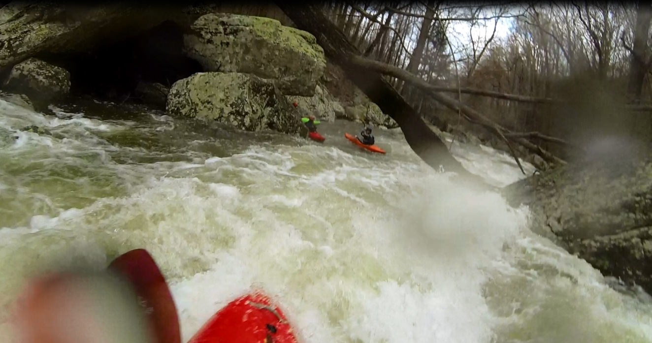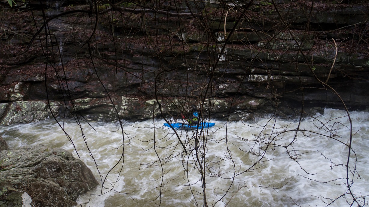 Fishbowl (V to V+). At our flow, this rapid looked horrible. The hole was just huge. And to make matters worse the left line was blocked by a tree. Basically, just down plug down the middle. Right had the most outflow. Most of us seal launched in on the right around the rapid.