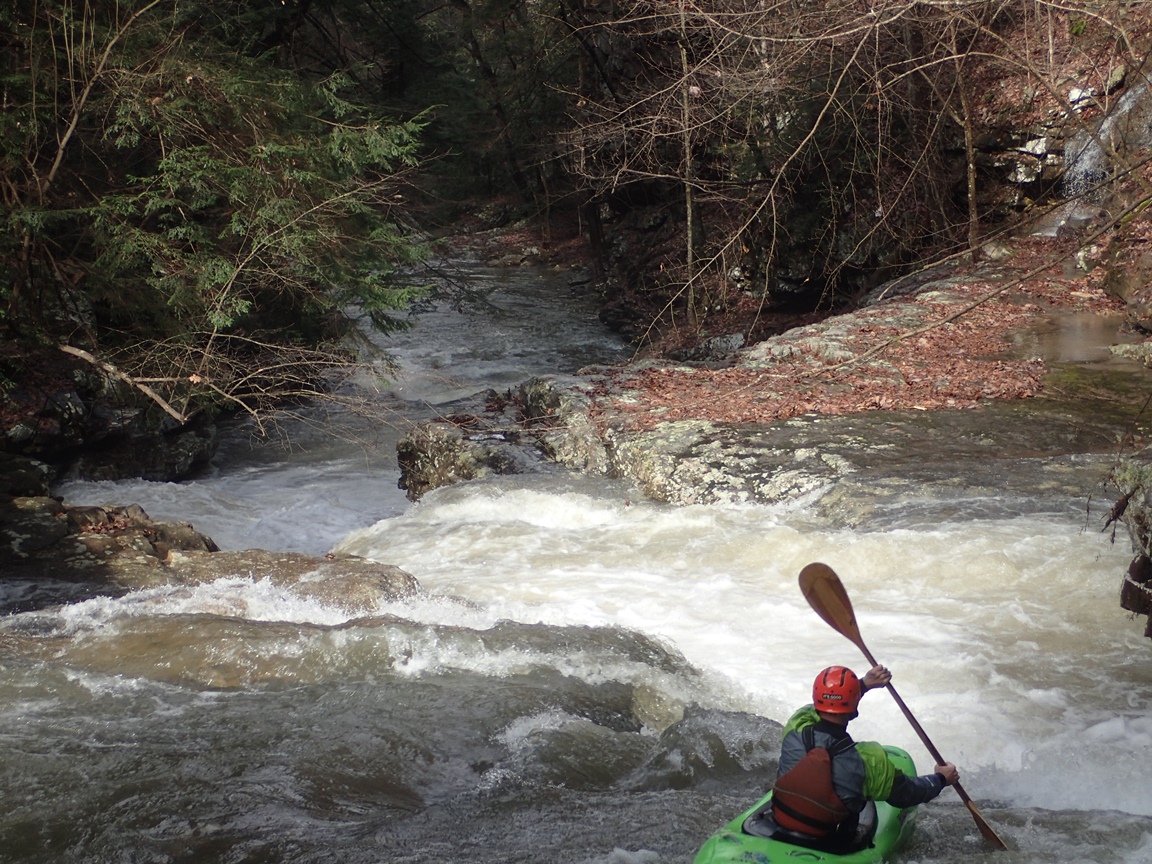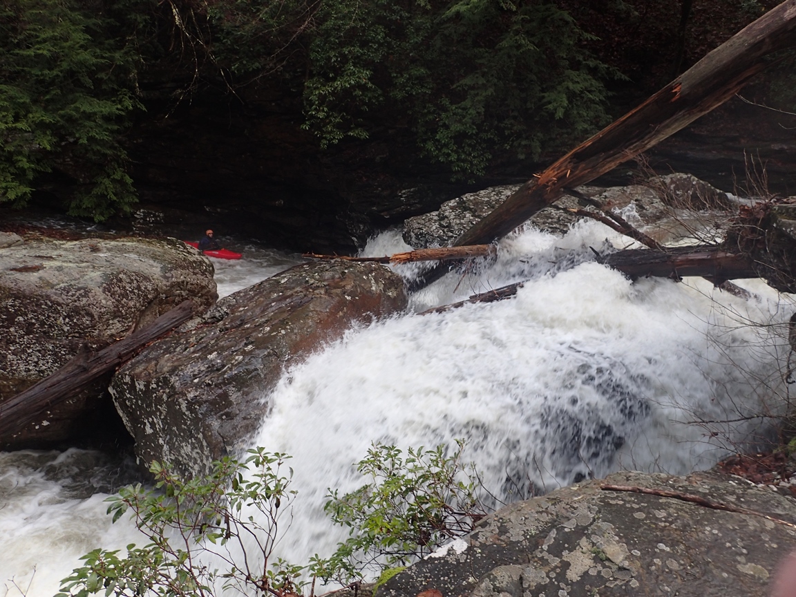 Momentary Lapse of Reasoning (V- to V). Some people caught an eddy on the left at the lip, but Nate suggested going direct to maintain speed which I also agree is the better approach. The river bends left and approaches a step drop. At the lip, the flow drops over a a tight right turn and descends some twelve feet. At low flows this can create a crack, At good flow just boof the peak of the water. Below is a small double drop.
