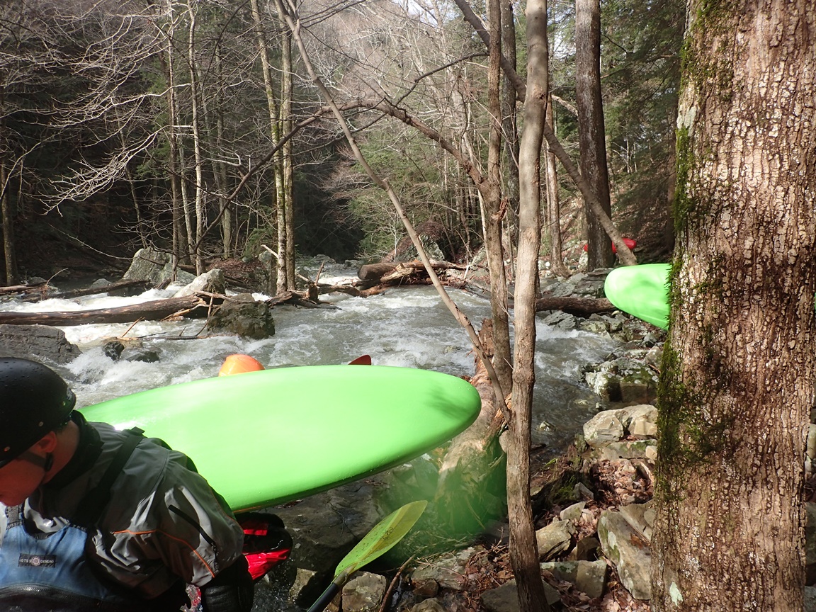 Woody (IV+ to V-). This section had some holes with some wood. First we went far left under a tree where a good size hole was waiting, stay left and seam the outflow. Downstream 100 yards was another large ledge with a large tree in it, keep power and drive left. Or sneak around it to the right. Beatings have occurred here.