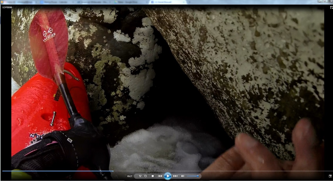 Omega (V). So we were told, half of the river goes into a sieve at the bottom on the left. I scouted, confirmed and noted the line did not look hard. Just boof down the middle, not too far left to avoid pitoning, and then ride the curlers and holes and stay right or paddle away from the left once the holes cease (there are like 20-30 feet between the holes and the sieve). What Reber, Lane, and I did not note is that at this flow if you over achieve to the right you could end up being pulled/sucked into a cave, sieve thing at the top on the right. As I braced against both sides of it, my stern starting to suck down I thought for sure it was over. Luckily, my stern disengaged and I shoved back into the curlers frantically trying to brace my way through so I could actively paddle away from the sieve.