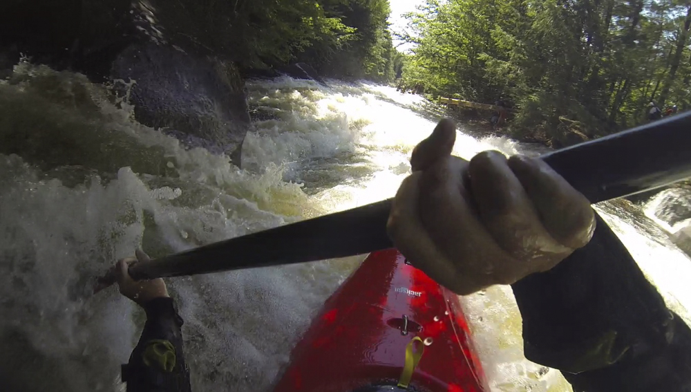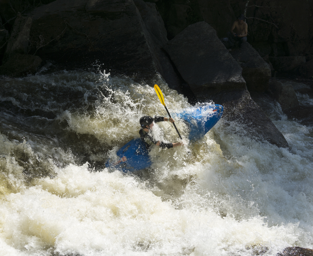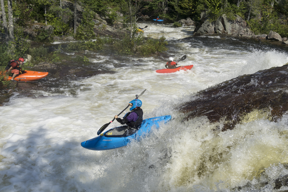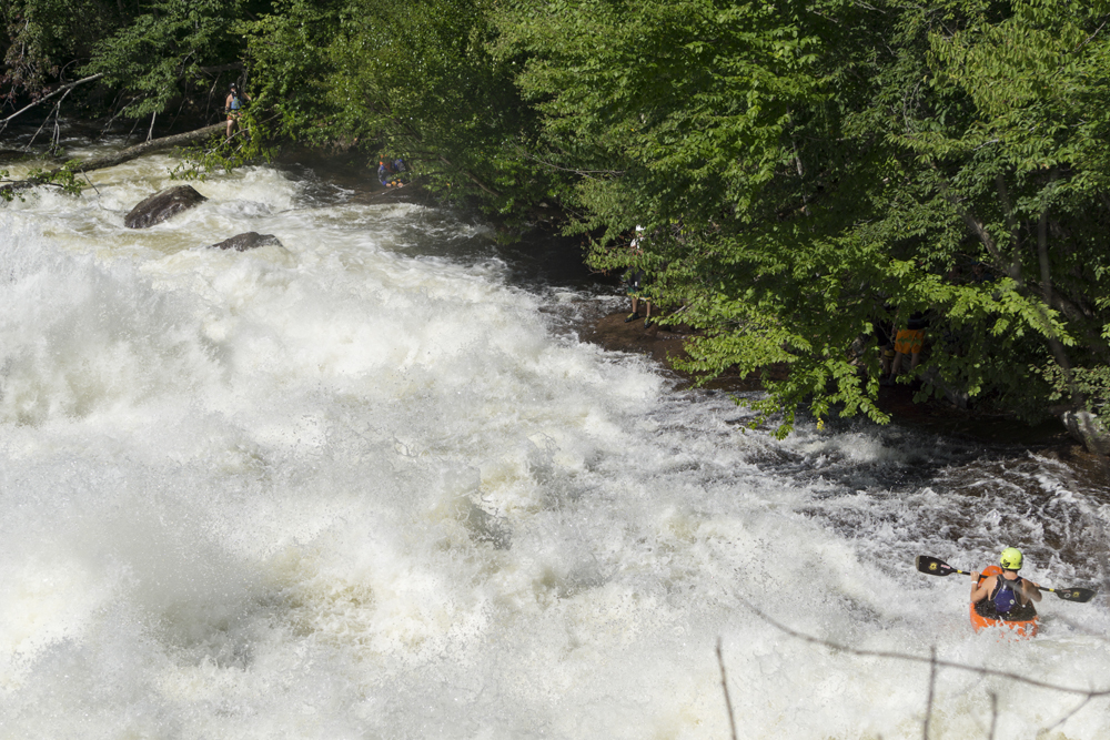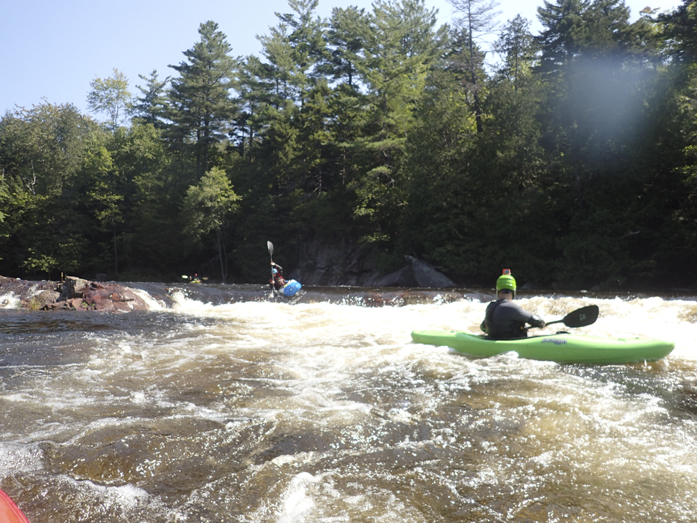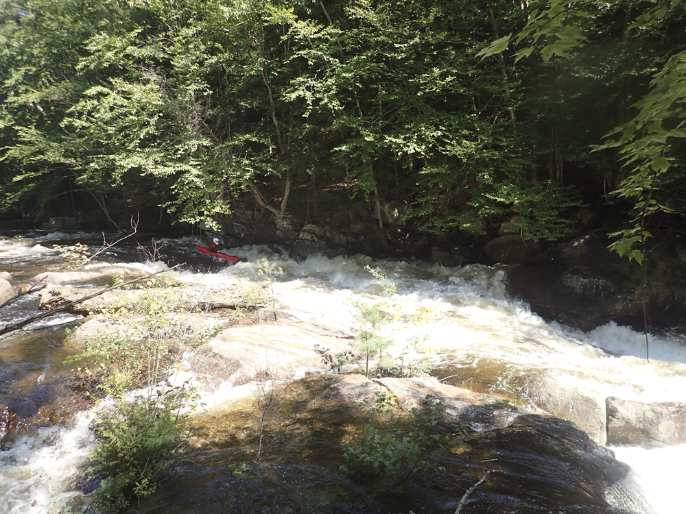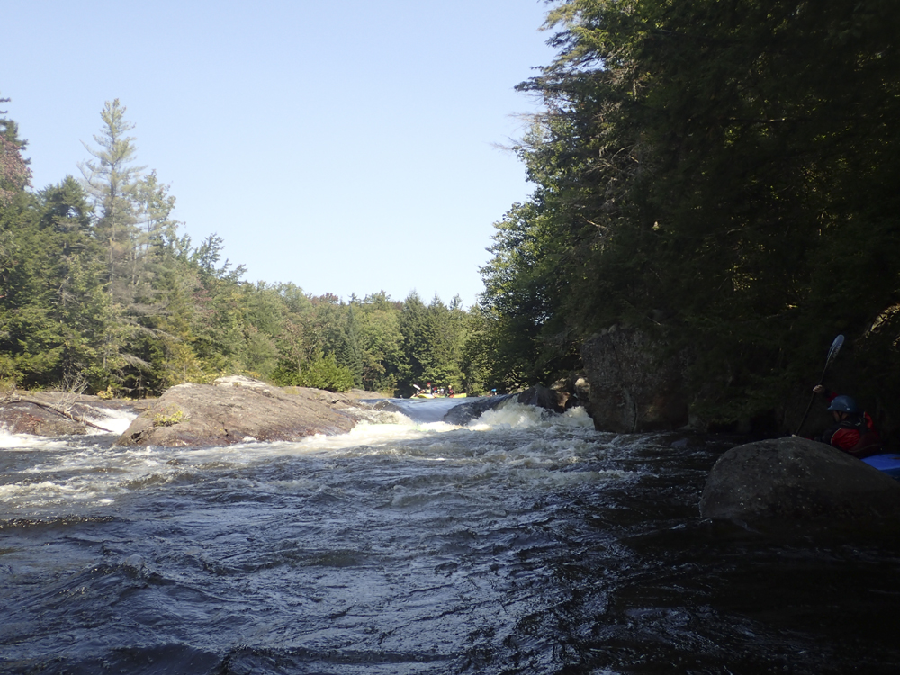 - Moshier Falls (IV+). So much fun, and despite the story in the intro, worth a scout prior. The scout trail is easy to follow and lets you see all parts of the rapid. It also allows for portaging (or laps), whichever way makes the day more fun for you. The first of four tiers was a nice small double drop, we ran far left with just a smidge of right angle and momentum. This then leads to the part that gets most people, the river bends left and slides into a large hole. Some opt for going far right, sliding down through the end of the hole. I liked the line on the inside left which rides the curler to the top of the hole. Super run. Sometimes it eddies you our far right. Catch too much of the curler and you are in the hole. Downstream 100 feet of boogie is the photo famous part of the drop, which is a nice 5 foot shoulder boof off of the left shore. Lots of people melt it. Just be aware if you swim, swim down the gut and not far left as the boof lands just past a crack in the rock that is apparently a sieve. The final tier is just downstream and a ramp into a fluffy hole that you run right of center moving left down the gut. Great fun! Walk up and run it again fun! Just below is take-out.