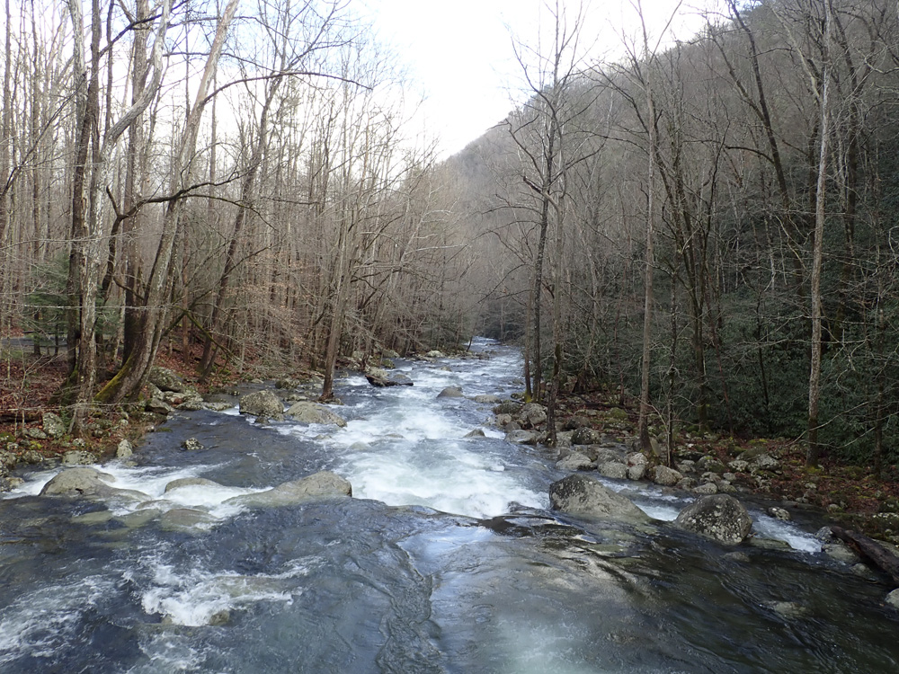 Put-in: Continue up Waterville Rd. In 0.8 miles you will cross Mt Sterling Rd, this is where the gauge is, on the bridge on that road. Continue straight across Mt Sterling Rd onto Big Creek Campground Loop Rd which quickly enters the National Park. Follow it for 0.9 miles. Don't be fooled into dropping down into the horse camp, stay on the main road until you get to the parking at the trailhead.