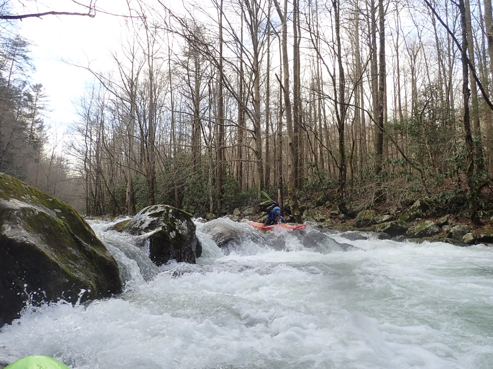 Lots of rain fell the prior day, but surprisingly, only a handful of options had come in. With hopes of getting a new run, we agreed to a day with Jim, Caleb, and Emily. Their plan was to hike up Big Creek. With Diane 4.5 months pregnant, however, neither the hike with the kayak nor the steep rocky nature of that section seemed like a good decision. So, while they did that, Diane and I did the Lower section of Big Creek which is a couple steps easier and safer for the baby. I was happy too, as I had done Upper but had not done the Lower, so a new run was achieved. We did two laps on the run, I thought that the river was going to be really low, at 2.8-2.9 or so, but this actually ended up being good fun still, with an exception of the very last rapid. That one is a piece of you know what. The rest of the run however was a continuous smoky mountain typical affair, but limited to class III rapids that I am sure at higher flow, due to the continuous nature, earn a class IV rating. To our surprised, we enjoyed it enough that we did a second lap on the run.