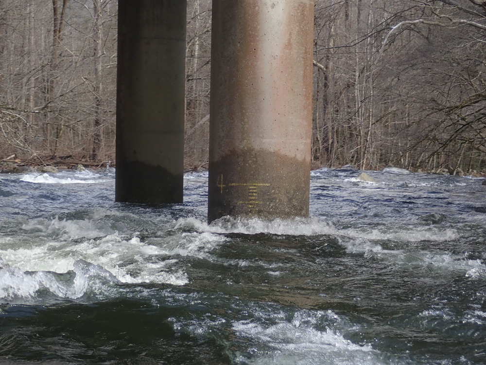 - S-Turn (III+ to IV). The biggest individual rapid on the run comes within site of the bridge where the gauge is. The river s-turns to the right, left and back right with some off angle holes to line up and punch. We went down the center of all of them which went well, but I can see the off angle holes and cross currents immediately behind them could give people issues. The bottom is a small ledge, I boofed a shoulder right of center, though really any number of places was ok to exit.