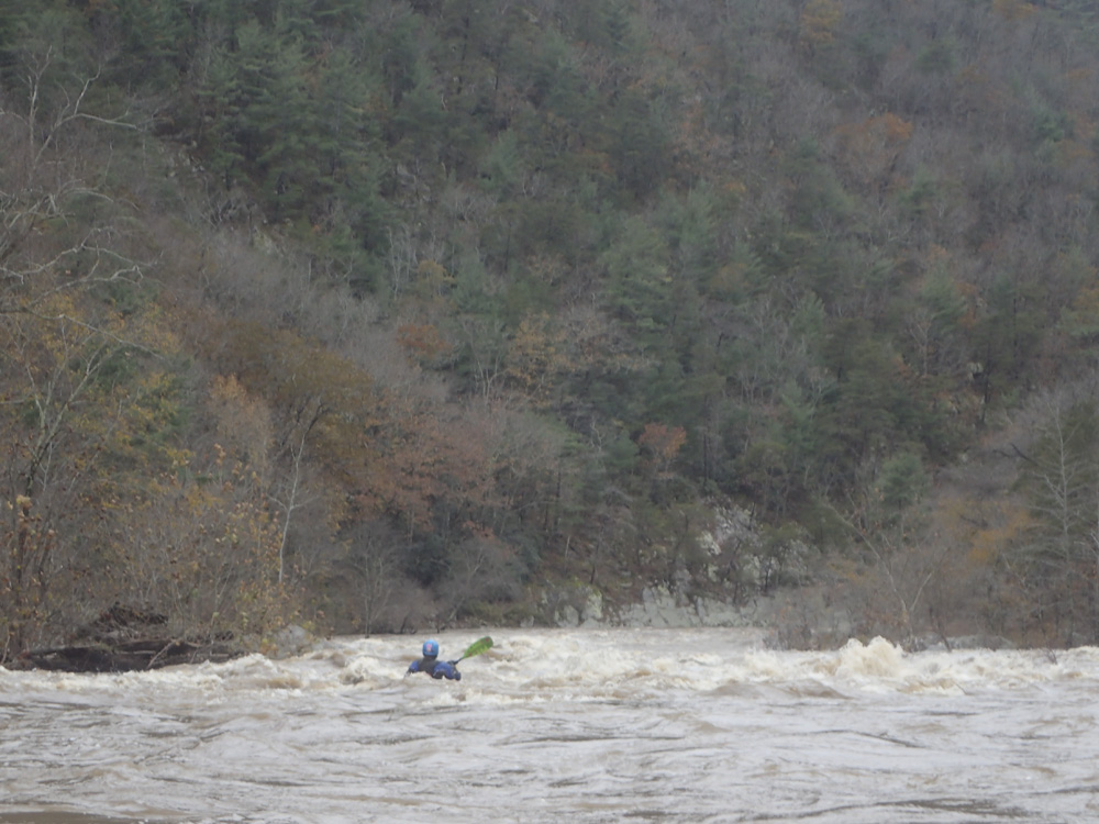 Diane had technically done this run, at a very similar flow non-the-less, but that was while she was interviewing for residencies out east so that puts it at 5 years ago. Anyone that knows Diane knows her memory of rivers is not super dependable so we approached the run with fresh eyes and somewhat cautiously. The action starts pretty quick with a ledge drop that had a few lines. It was around this time we started to notice large trees. We knew that Suddy Hole was somewhere downstream and packed a dangerous hole. We quickly found the rapid, which was tricky because the lead in needed to be run on the right and the eddy was far left immediately below. We caught the eddy and scouted the far left channel, which was clear so we ran it. There is a line in the middle, but it also had a tree in it our day. Below the river constricts into a few nice gorge rapids. This section feels the stoutest, certainly has the biggest waves, but also was clean with no real hazards to dodge. Below, things open up and get easier before you quickly find yourself at the French Broad confluence. At the high flow, the miles on the French Broad went quick. We went left of the island at Needle Falls as with the high flow a weir just didn't sound appealing. What we found was fun class III. Another nice class III rapid not far below then led to the mellow last mile to where the car is parked.