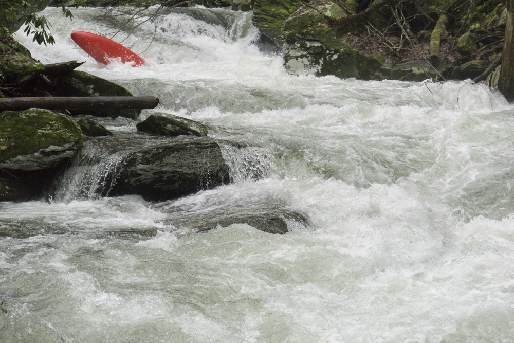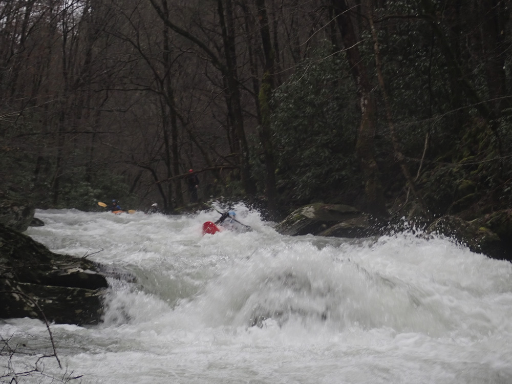 Third Rapid (IV). The biggest rapid on the run. At low flow, you run the top move on the right. But our day, it was a bit of a folding move with a sticky hole. The one person who went over there got backendered. The rest of us went off the left side of the middle rock to boof over the ledge. The landing tended to want to push you hard right, but for the next hole you wanted to be in the middle which led to another seaming fold which was also best in the middle. It then finally took a break, where we eddied out on the left.