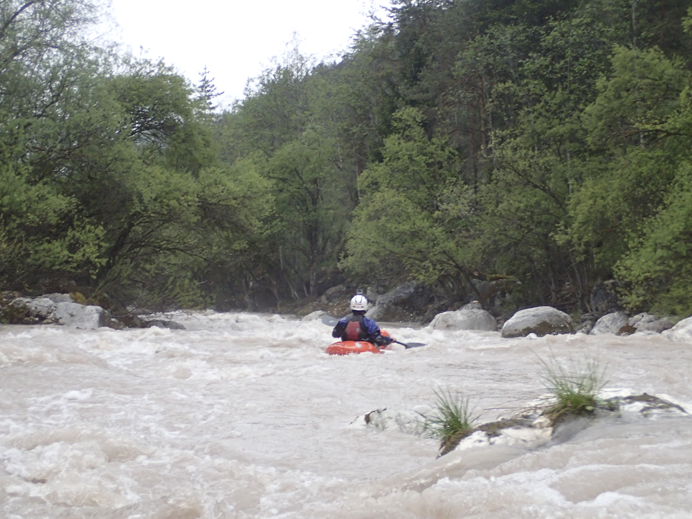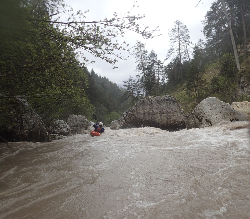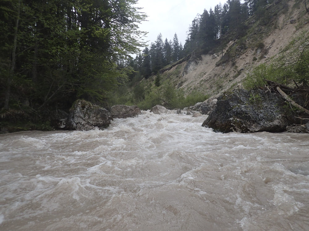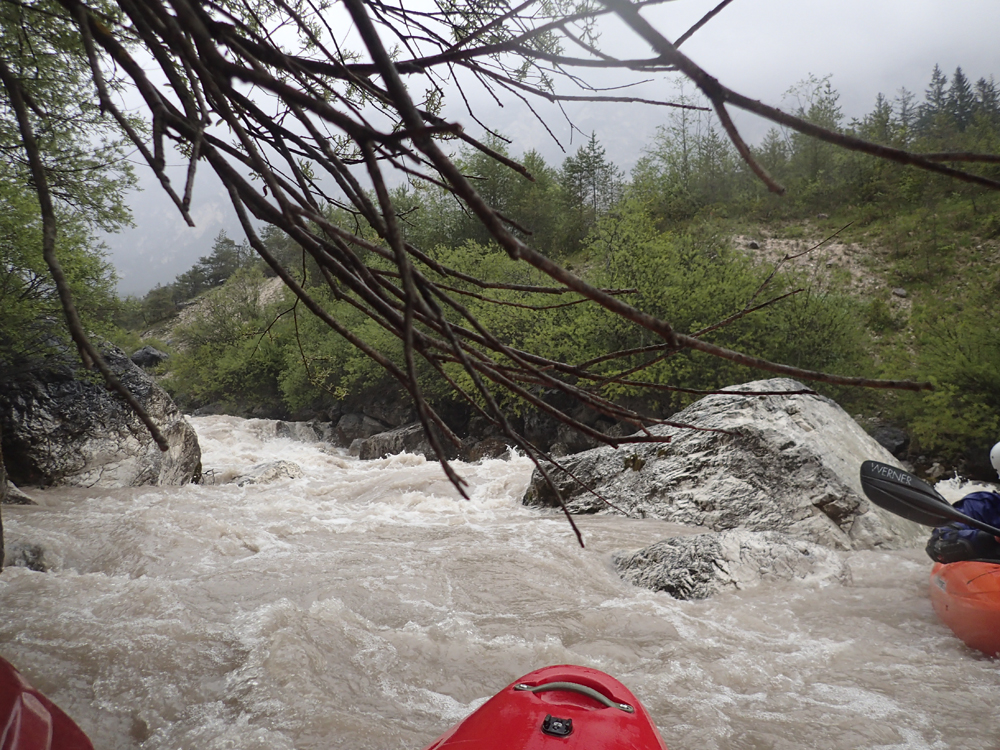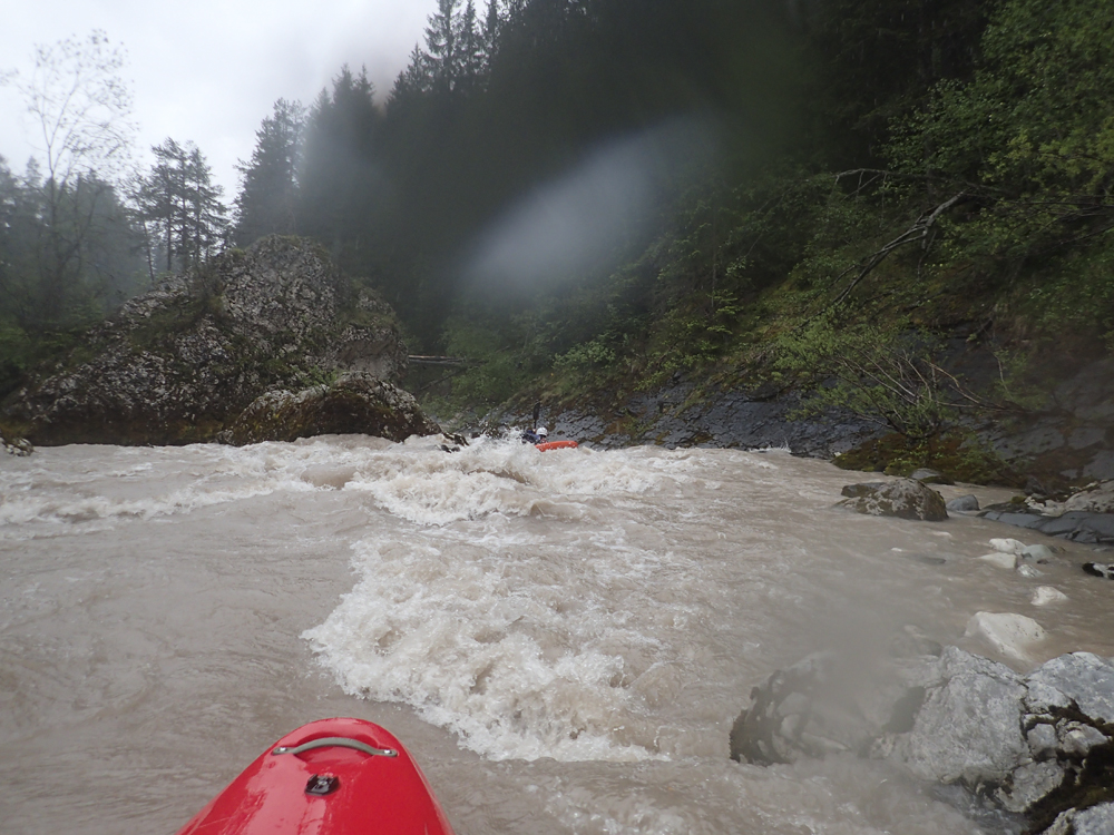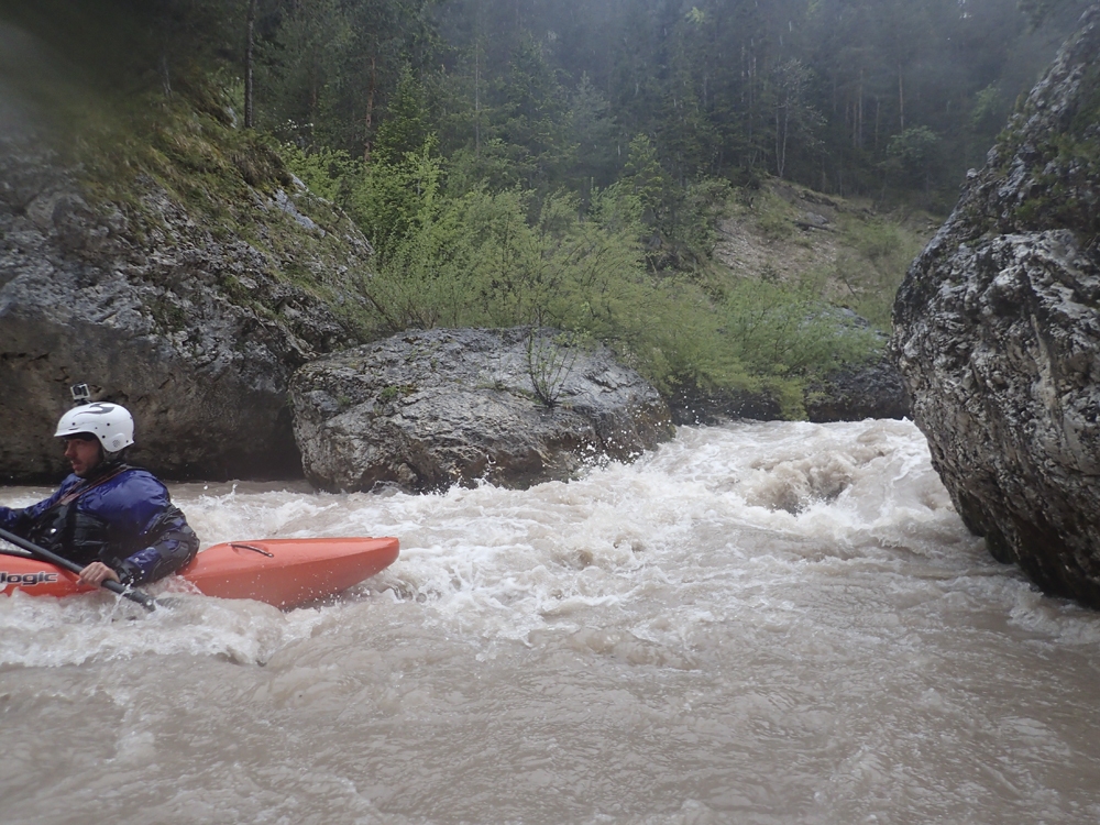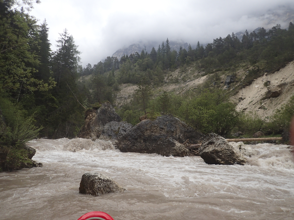 The run was called the "Pearl of the Dolomites" in the German guidebook that we were provided by the Italians at the put-in for the Defereggenbach Waterfalls. So which high hopes we shoved off just as the rain really started and the mountains disappeared. The run was supposed to be relatively short. So I anticipated it would be action from the start. The river was high, there was a lot of construction, and all we had was splashy class II for a mile or two in an ugly little canyon with construction debris sides to it. I began to dread thinking that this construction must have buried whatever used to be there. But to our luck, just around the corner, the rapids began and once they began, they did not cease.