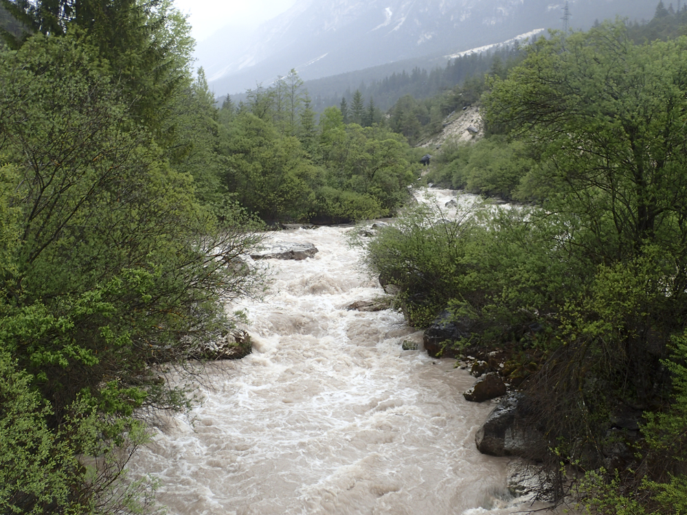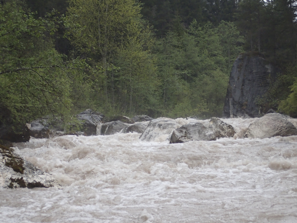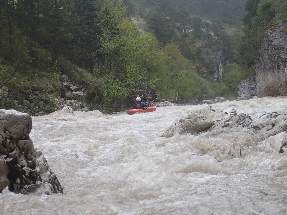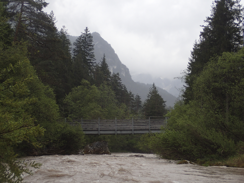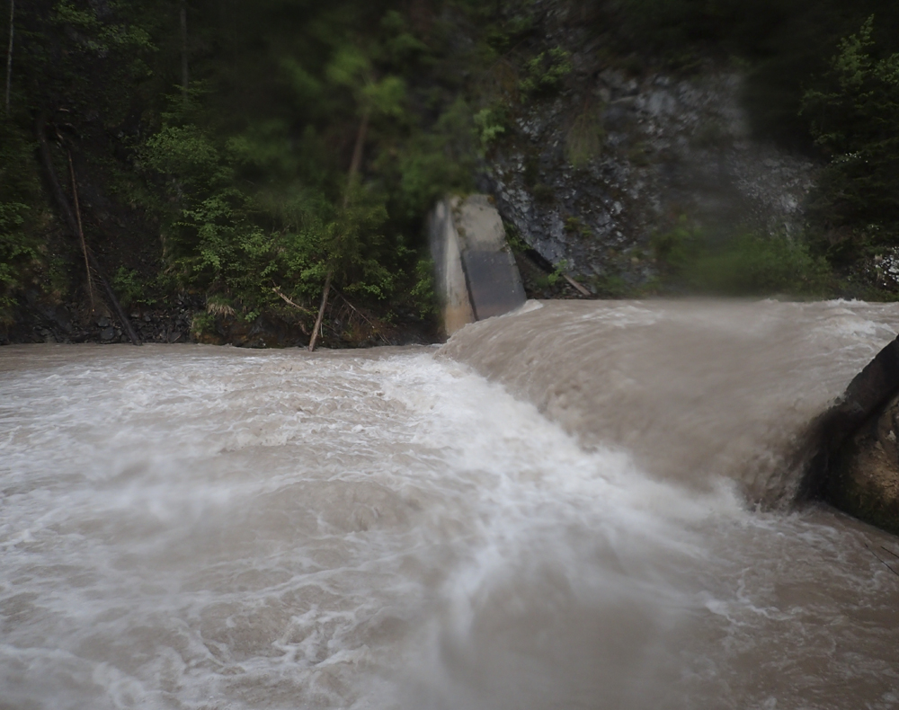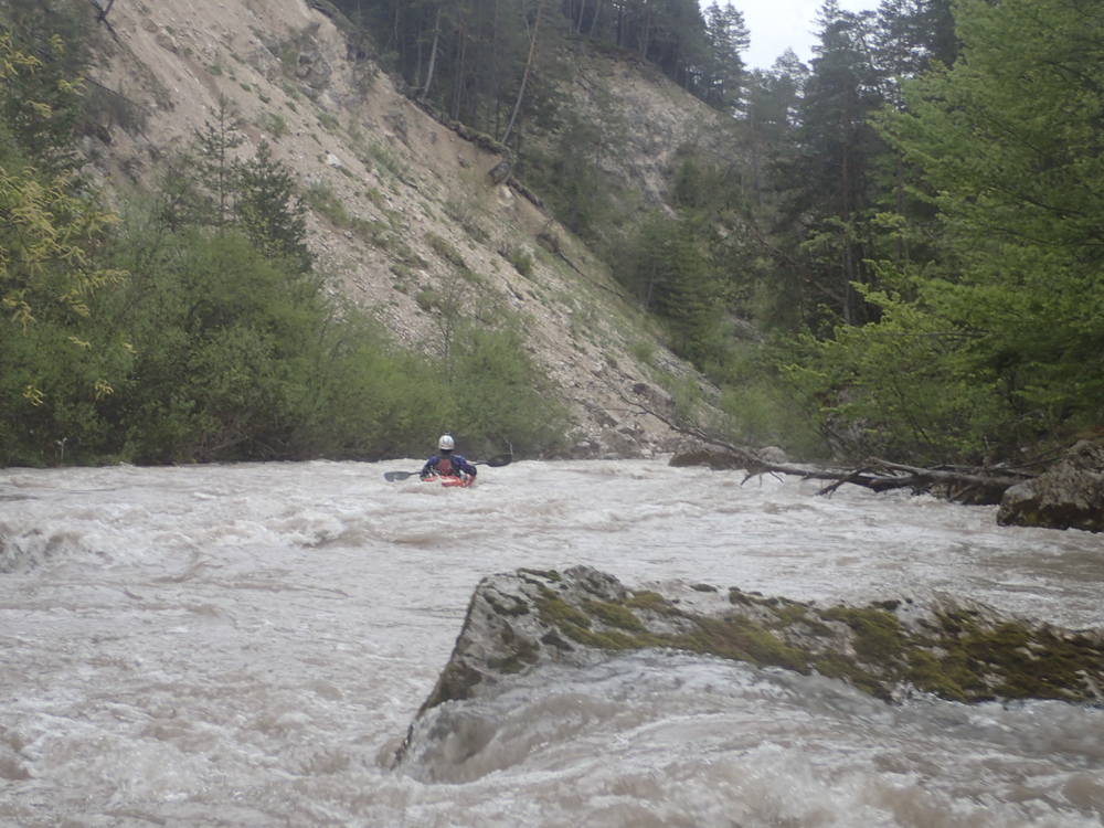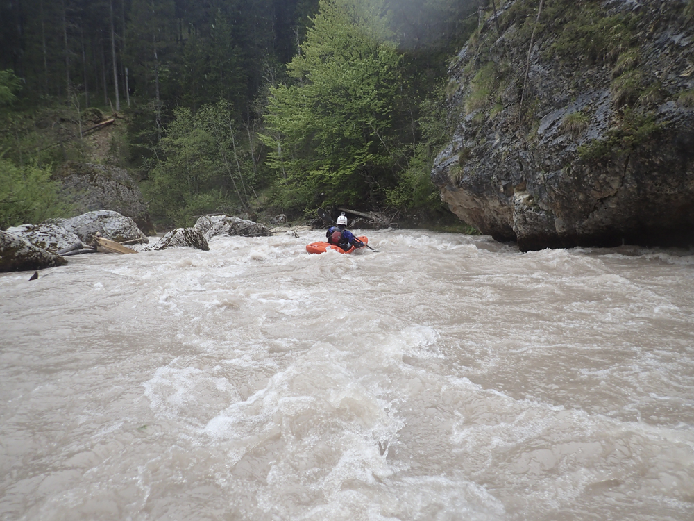 The run was called the "Pearl of the Dolomites" in the German guidebook that we were provided by the Italians at the put-in for the Defereggenbach Waterfalls. So which high hopes we shoved off just as the rain really started and the mountains disappeared. The run was supposed to be relatively short. So I anticipated it would be action from the start. The river was high, there was a lot of construction, and all we had was splashy class II for a mile or two in an ugly little canyon with construction debris sides to it. I began to dread thinking that this construction must have buried whatever used to be there. But to our luck, just around the corner, the rapids began and once they began, they did not cease.