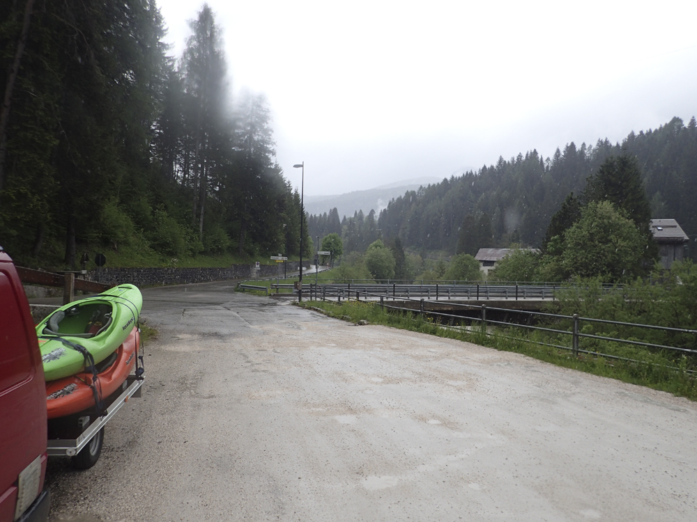 Put-in: Head back to Cortina. Follow SS51 north for 7.3 km to the town of Aquabona. Just past the Area 51 Restaurant, turn left onto Localita Pian da Lago and drop down to the river. This was actually a bit of a residential area... but there was a wide gravel area across from the house.