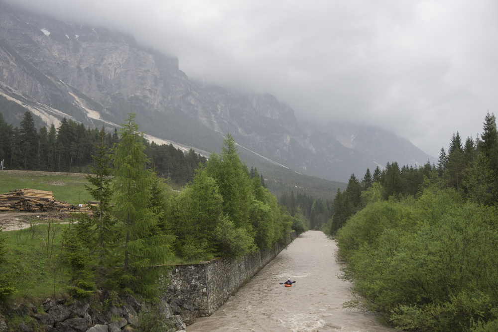 Waking up in Italy, we were slow to pack our stuff up as the rain was still lingering. The dry riverbed we had camped next to had a small trickle of water coming down it. I can only imagine the rainfalls that it must take to make the entire riverbed fill with water! With hope to get on the river before the rain started, Jim and I eventually packed up and headed further into the Dolomites to the town of Cortina, site of the 1956 winter Olympics. The drive was quite spectacular, though views of the Dolomites themselves at this point were already beginning to be obscured. Part of our hurry was to see the scenery, but the other part was that Jim and I were on our own this day. Harry was taking a family day and Reiner had gone home for a few days of work the night before. This meant we would be hitching our shuttle. An adventure in its own right as prior to this trip I was trying to study (learn) some German and took no time to brush up on my Italian which I have left stagnant for the past 2 years. But it would be made easier if I was still dry at that point of the day. With that in mind, we dropped boats and I drive to take out to drop the car to hitch at the start. To my luck, the first car picked me up and I had a very nice conversation... at least I assume it was nice, I didn't understand much of what he said but I did get he was going to Cortina which was perfect because put-in was just a few kilometers on the close side of the town in the town of Aquabona. Not to brag, but I guess I am basically fluent in Italian. Jk.