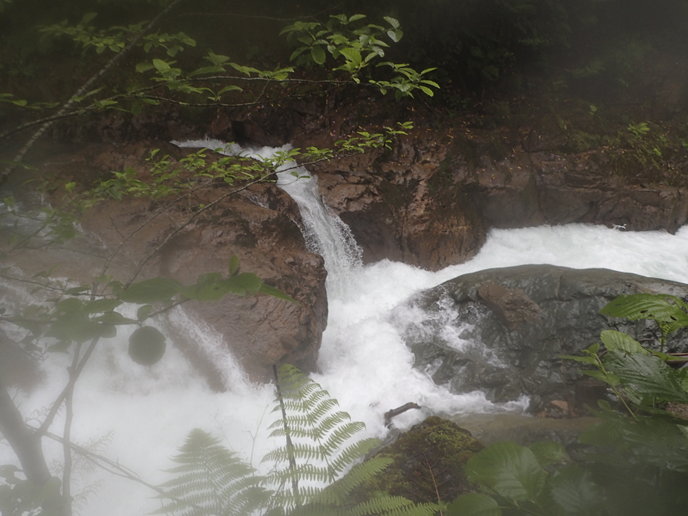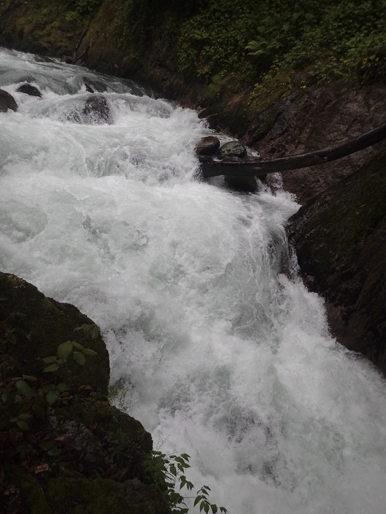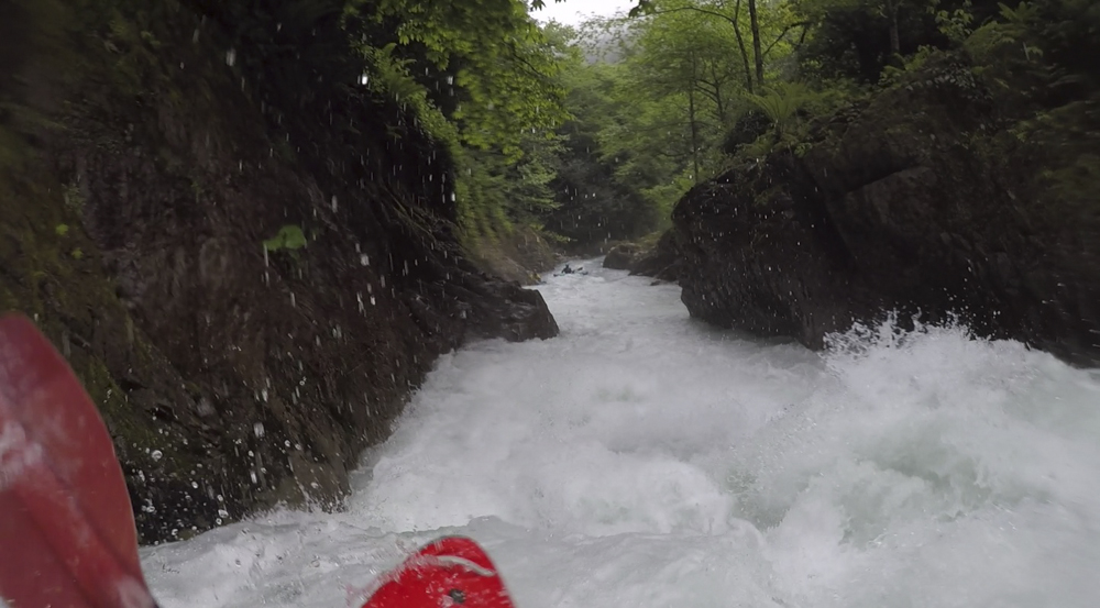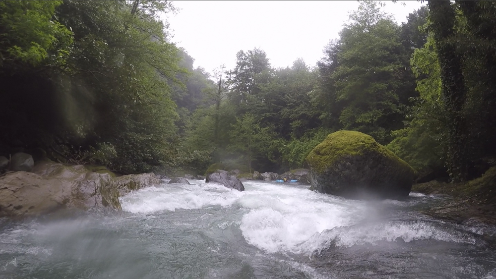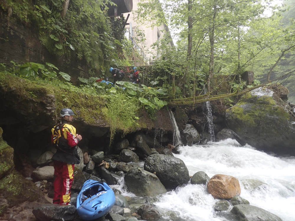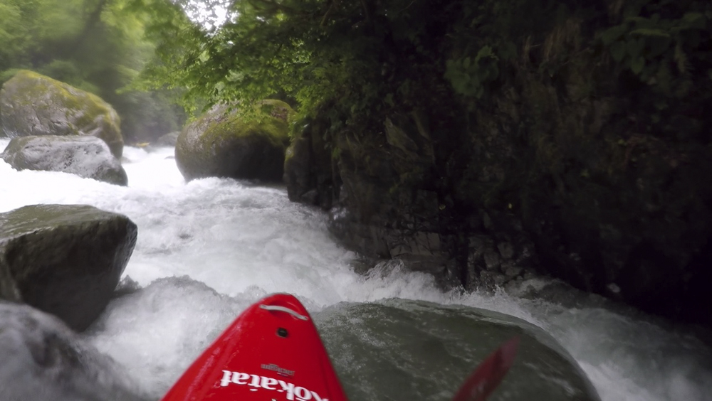 After running the Middle, we headed up to the top. However, a few in the group decided that they did not feel up to more time on the water so only 4 of us headed to the put-in. Just getting to the water on this one is a bit of an obstacle course. First, you throw your boat over a fence into a holding pool below. Then climb down the ladder and walk along the narrow wall of the pool, falling off into the river would be very bad as there is a sieved out class V+ immediately at the base of the wall. I chose to slide on my butt. Then, get your boat to the far side, and lower it down a small cliff to the shore below, make sure it does not take off on you as the rapids start immediately! Getting yourself down to shore requires delicate downclimbing on a slippery surface, but soon you will reap the rewards of this effort. The canyon below is tight, steep, technical, and unforgiving. However, it is beautiful with rock walls lining the river, and the dense Georgian forest overhanging the walls and blocking out the sun. The rapids despite being consequential are fun, however there is a mandatory rapid 3 rapids in that recently killed someone who was recirculated. That boater was revived, but this drop is known for recirculating people. And the kicker on it is that the first person has to run it with no safety as it is impossible to set safety on it until you are below. If you can muster the courage for the must run, then this run is a must when in Georgia!