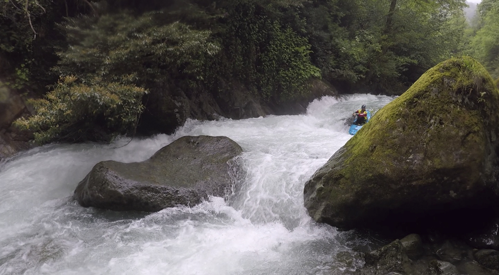 Put-in: The powerhouse which is located 1.5 km upstream of Gomi. You have to throw and go your boats to a small holding pool, and then climb around the wall to then downclimb to the shore.