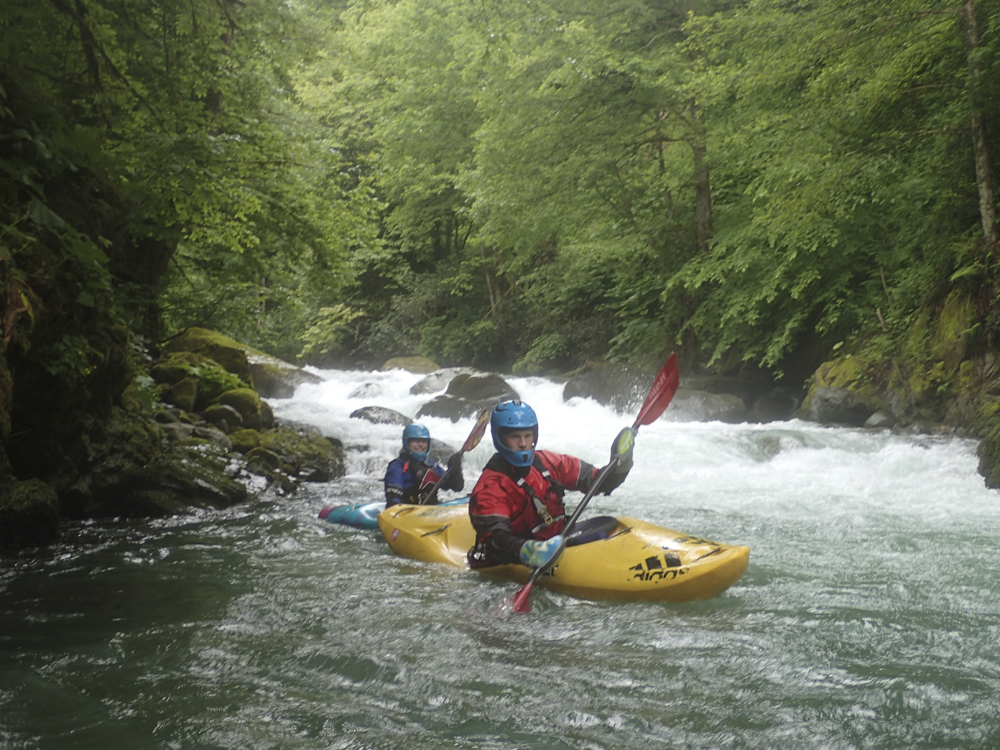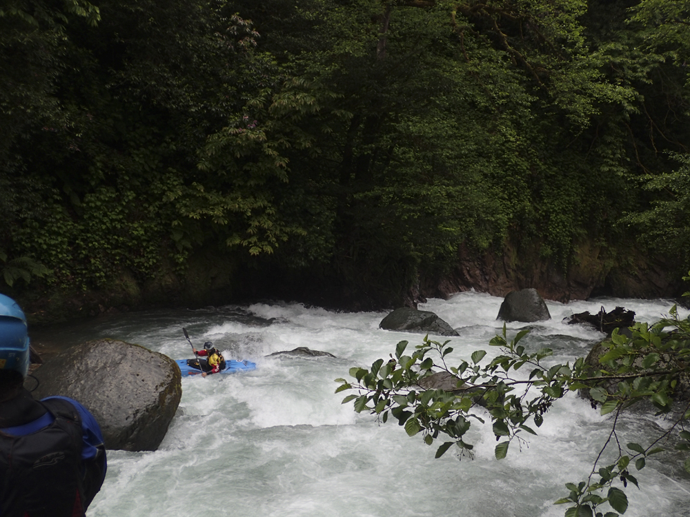 First Rapid (V). Scout right before running. We entered right and then eddied out far left below the entrance but before the main part of the rapid. The main part of the rapid is a pinch down the left shore. You then want to stay left, but lots get pushed right. Boof the next ledge which lands you on a ramp which slides down into a hole that is easy to get your nose up on assuming you are straight and in control. Set safety on the right.