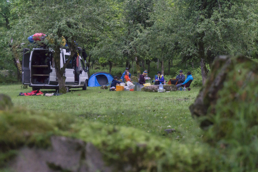 After our lap, the three of us, along with the fourth person who located there boat in an eddy just below the sieve rapid paddled down through the Middle. That afternoon, we headed to the nearby town and picked up Irina, a Ukranian, who is also a member of the British Rafting Team and was in country for the Euro Rafting Championships, and now that her rafting obligations were completed, was joining us for the rest of the trip. We ate a great late lunch, and then headed back to the Bzhuzha where we camped the night before, at the put-in for the Middle. That night, Egor and Alona BBQ'd us some great meat before we all crashed.