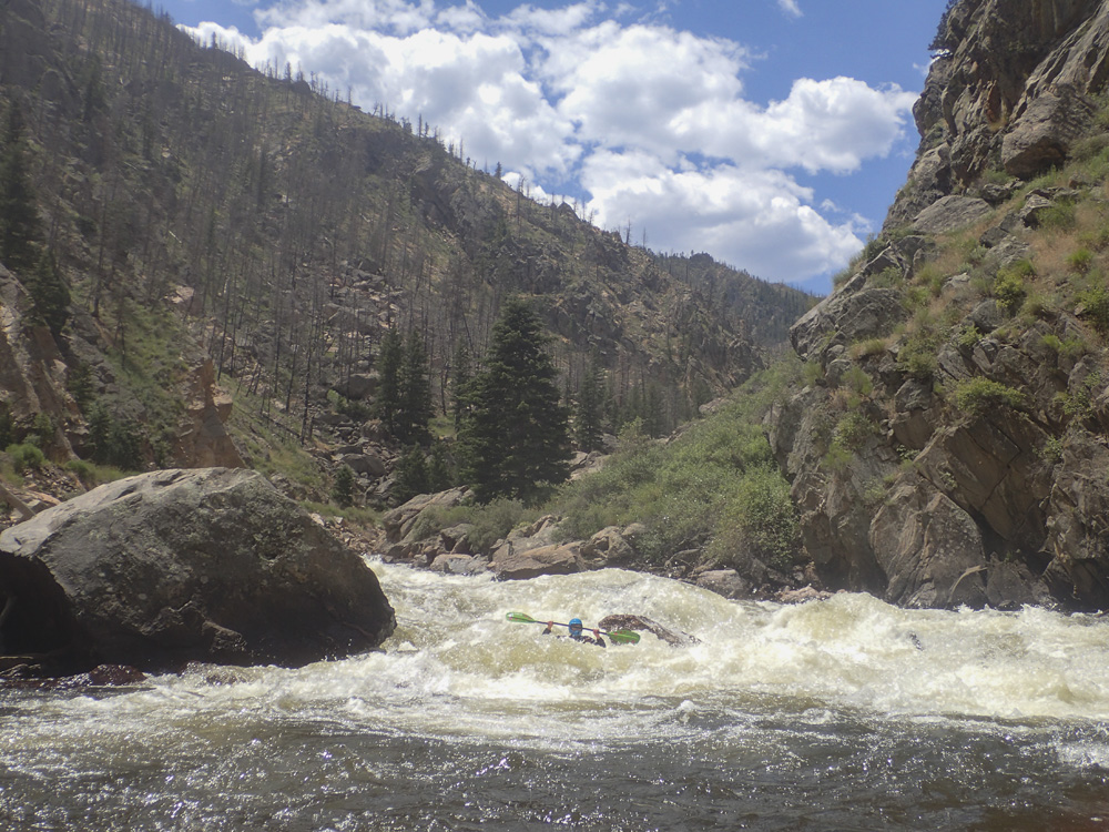 We still had 5 hours of driving in the morning to complete. I woke up early, a trend for the trip. I woke Diane up and had her sleep more in the car while I began the drive. The plan was to go look at the Poudre (as it is referred) and hopefully get the Narrows, at least the lower and maybe the middle. We arrived and quickly found our way to the top of the river, scouting the Lower Narrows first and deciding the rapid was good to go. We then headed up the canyon to look at the Middle Narrows. Little did I know, what we actually scouted was the Upper Narrows, which I knew would be on the high side. So after looking at the rapids, we decided that they looked doable, but dangerous for only two people. So we opted to not run them. Thinking that these were the middle, we were a little bummed. It wasn't until a few days later that I figured out that by putting in below these rapids, the boogie class IV that we ran leading up to the Lower Narrows was indeed the Middle Narrows. So yea. Whoops. So anyways, we dropped gear and drove down some 14 miles downstream to leave our car and hitch back to the top. The road isn't huge, but I quickly got picked up by a local who went out of his way to give me a ride to the top, so thanks to him!