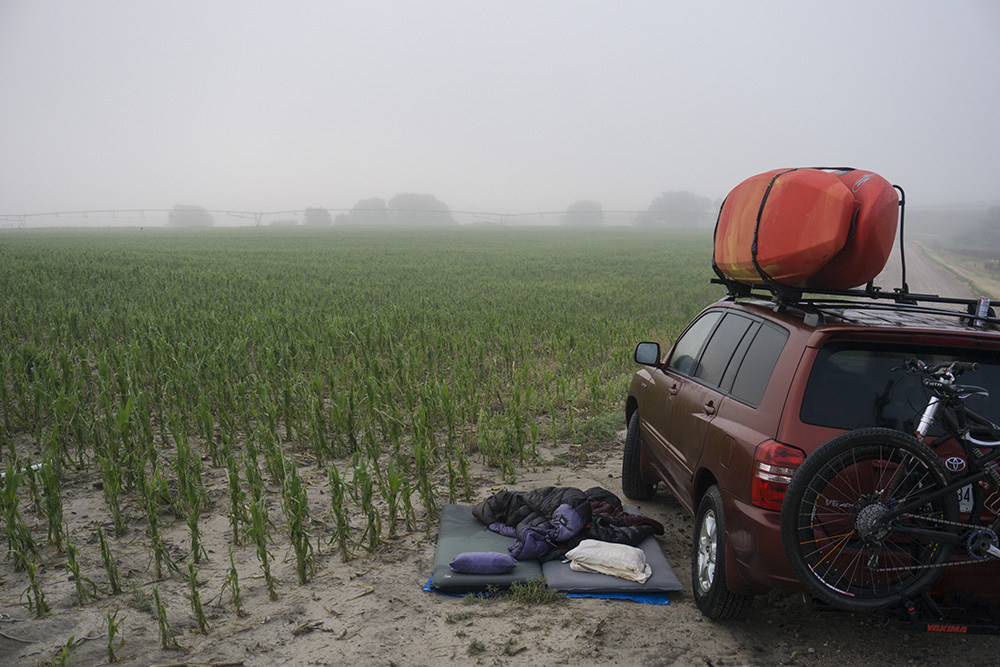 Day 1 started at 5:30 am when our alarms went off. By 6 am we were on the road. The route to Colorado passed through St Louis, where I have been on site working with a client for the past year. Diane had never been and had never met any of those colleagues so we stopped in for lunch so she could meet a few of them. We then continued on through the rest of Missiouri and onto Kansas. We hit some massive rain storms that slowed traffic for several hours down to a crawl causing us to lose several hours. We knew we wanted to kayak in Colorado the next day, so we pushed on for a few extra hours to make up the time and ended up putting in 18 hours of driving and couldn't push on any more around 11 pm that night, about 30 minutes short of the Colorado border with Kansas. I had been scouring google maps to find a spot for us to sleep, but due to being deep in farmland, all we found was a small dirt road that was gated a short ways down so assuming traffic would be light, we pulled out the tarp and slept on the ground next to the car, basically in a corn field.